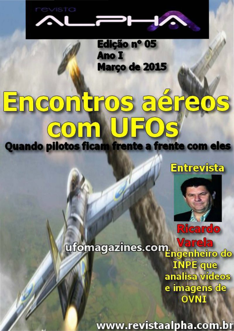 This issue of Revista ALPHA (March 2015) focuses on aerial UFO encounters, featuring an interview with Ricardo Varela, an INPE engineer who analyzes UFO videos and images. It also