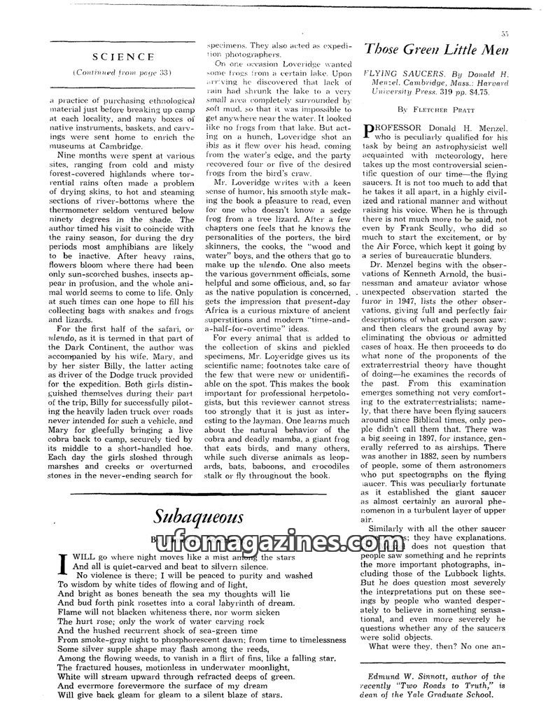 This issue of SCIENCE features a review of Donald H. Menzel's book 'Flying Saucers,' which debunks extraterrestrial theories by offering meteorological explanations for sightings.