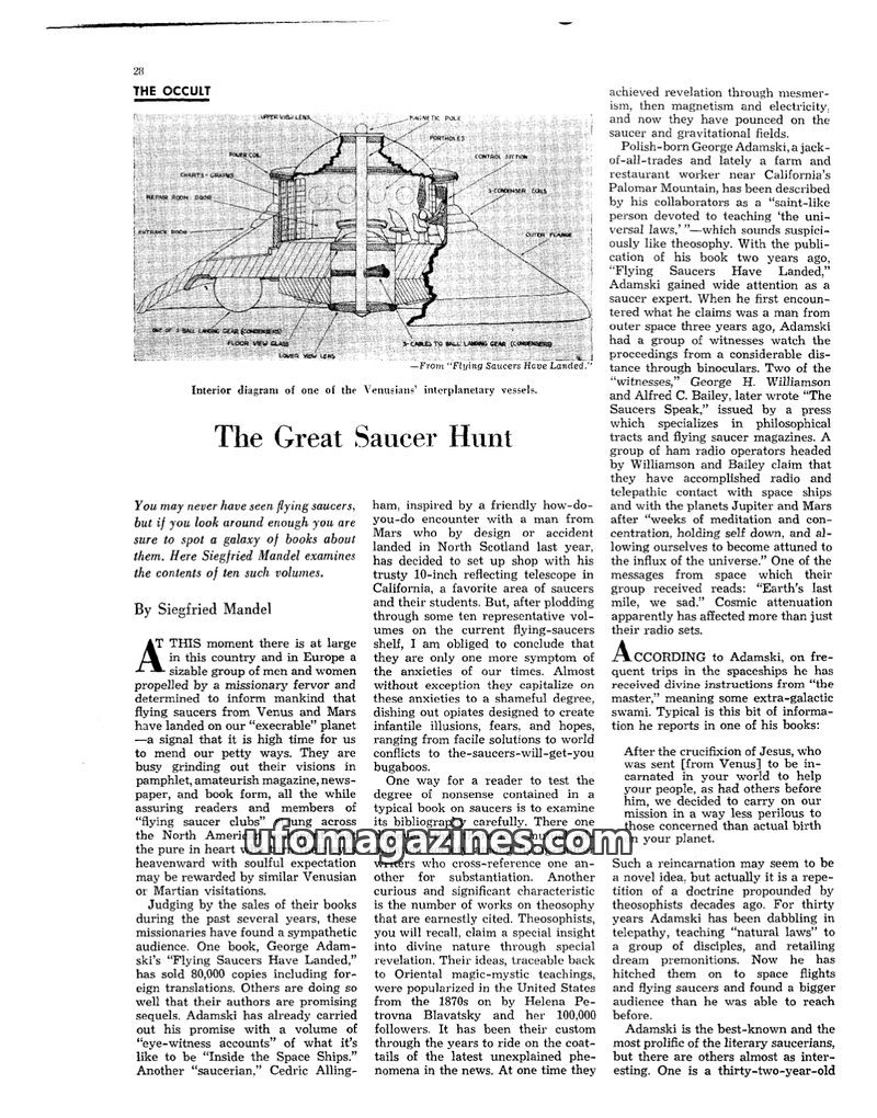 This issue of The Occult examines the phenomenon of flying saucers through a review of ten books on the subject by authors like George Adamski, Cedric Allingham, and Donald Keyhoe.