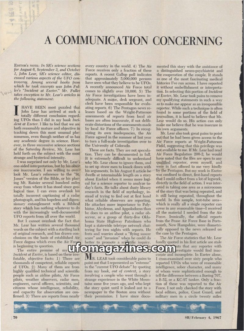 This issue features a debate between John Fuller and John Lear regarding UFOs. Fuller criticizes Lear's interpretation of evidence and his reliance on Air Force dogma, emphasizing