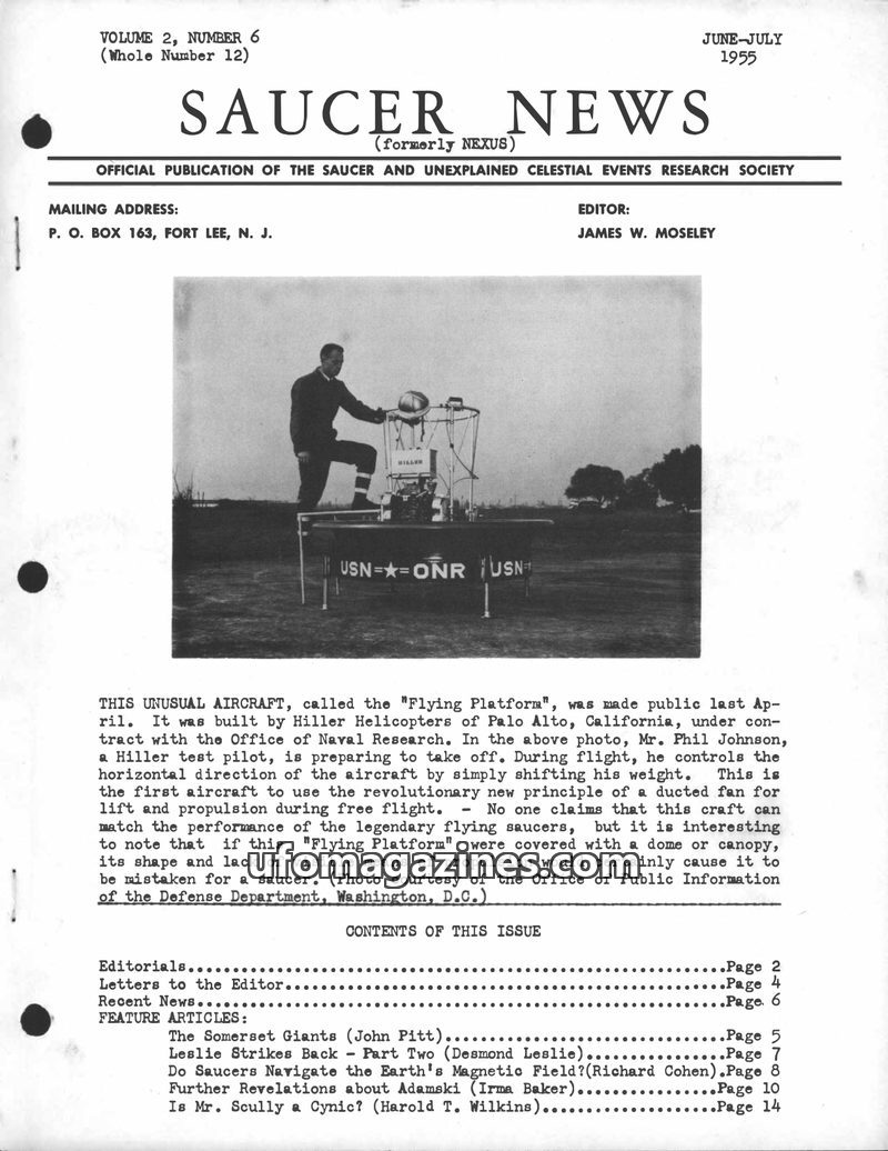 This issue of SAUCER NEWS, the successor to NEXUS, announces its bi-monthly publication schedule and subscription rates. It features an article on the Hiller "Flying Platform" airc