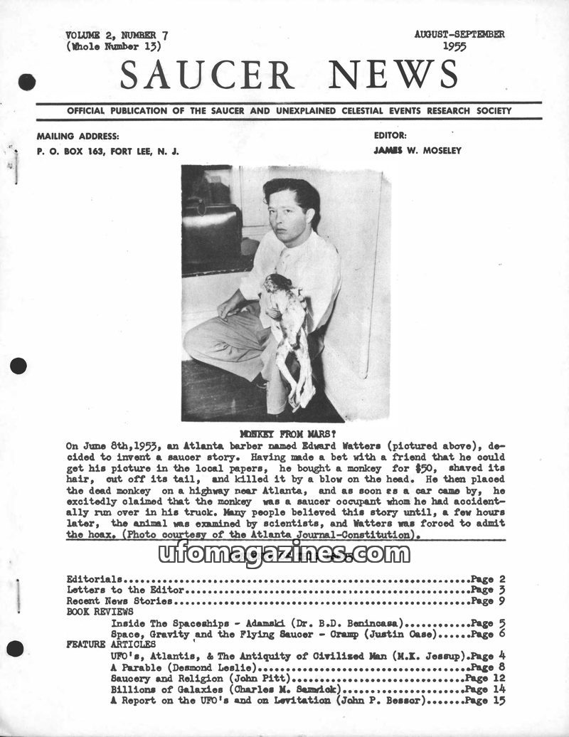 This issue of SAUCER NEWS, dated August-September 1955, covers a wide range of topics including a debunked 'Monkey from Mars' hoax, book reviews of George Adamski's 'Inside The Spa