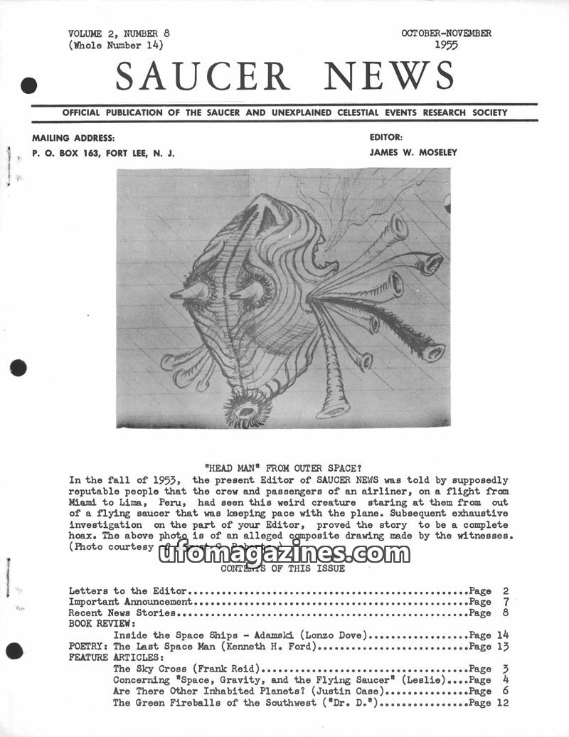 This issue of SAUCER NEWS from October-November 1955 covers a variety of UFO-related topics. It includes a report on the 'Head Man' sighting which was later revealed as a hoax, and