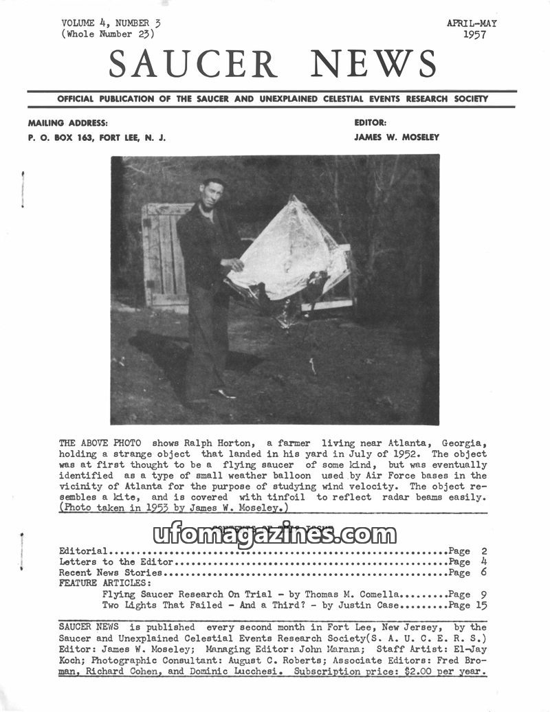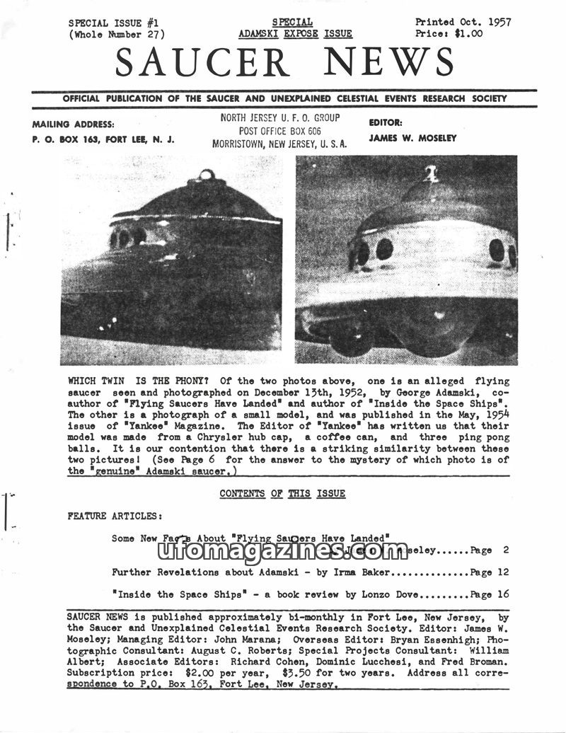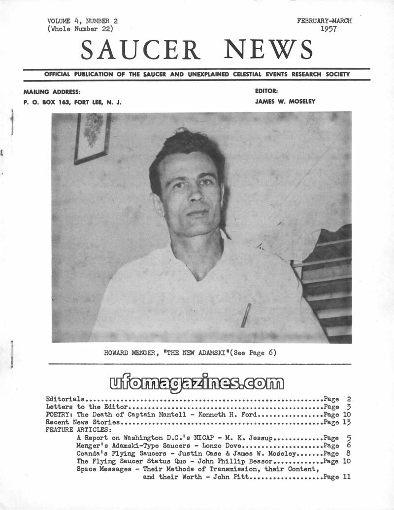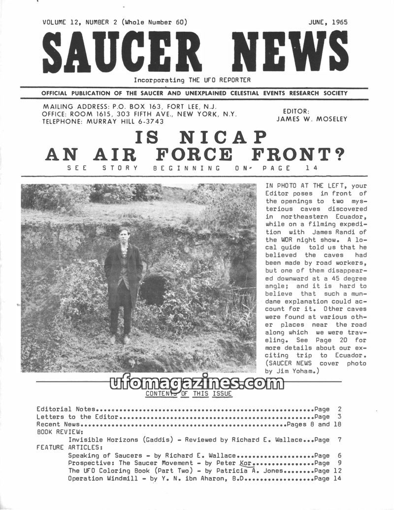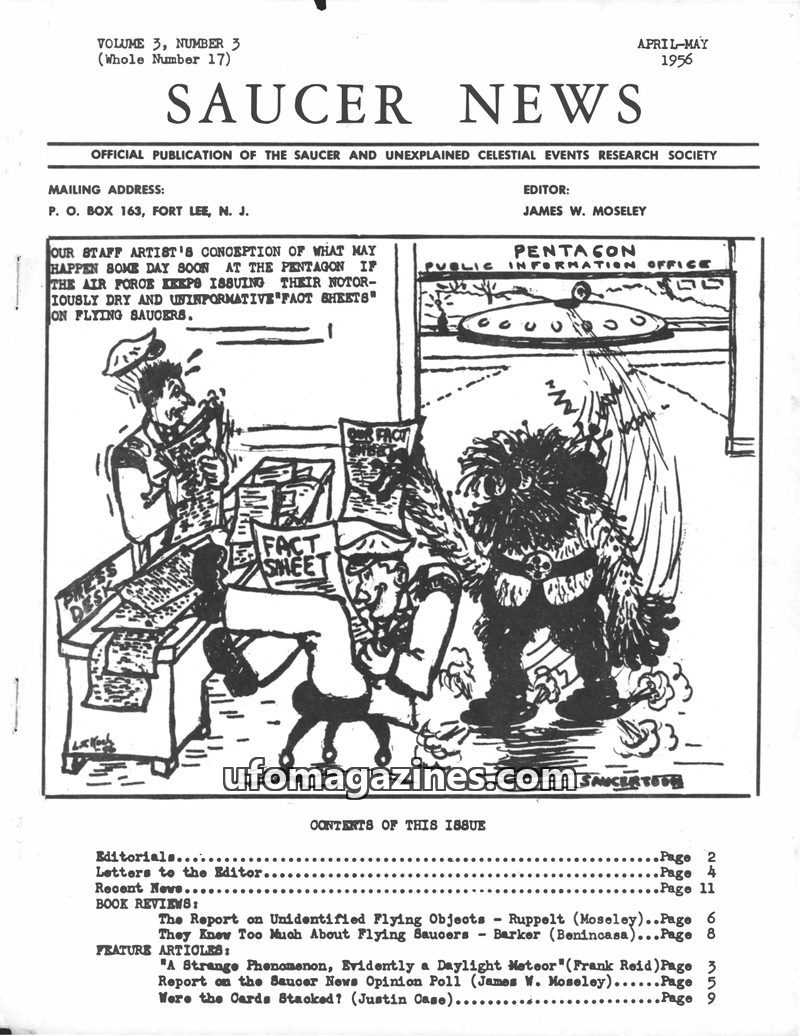 This issue of SAUCER NEWS addresses controversies surrounding the editor, James W. Moseley, refuting claims of him being an Air Force agent and exposing hoaxes by rival publication