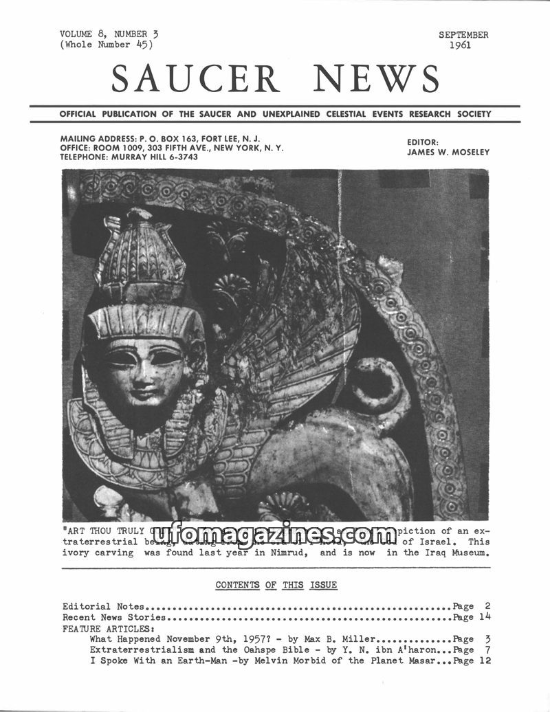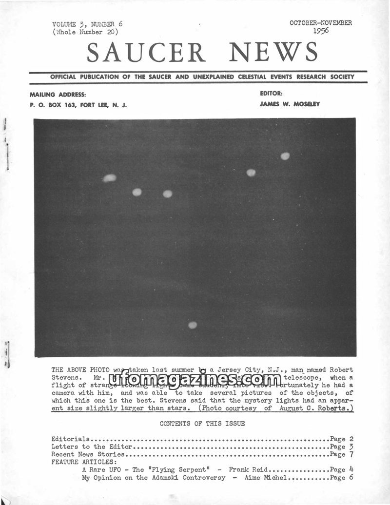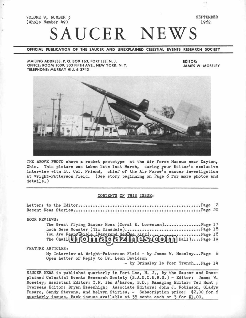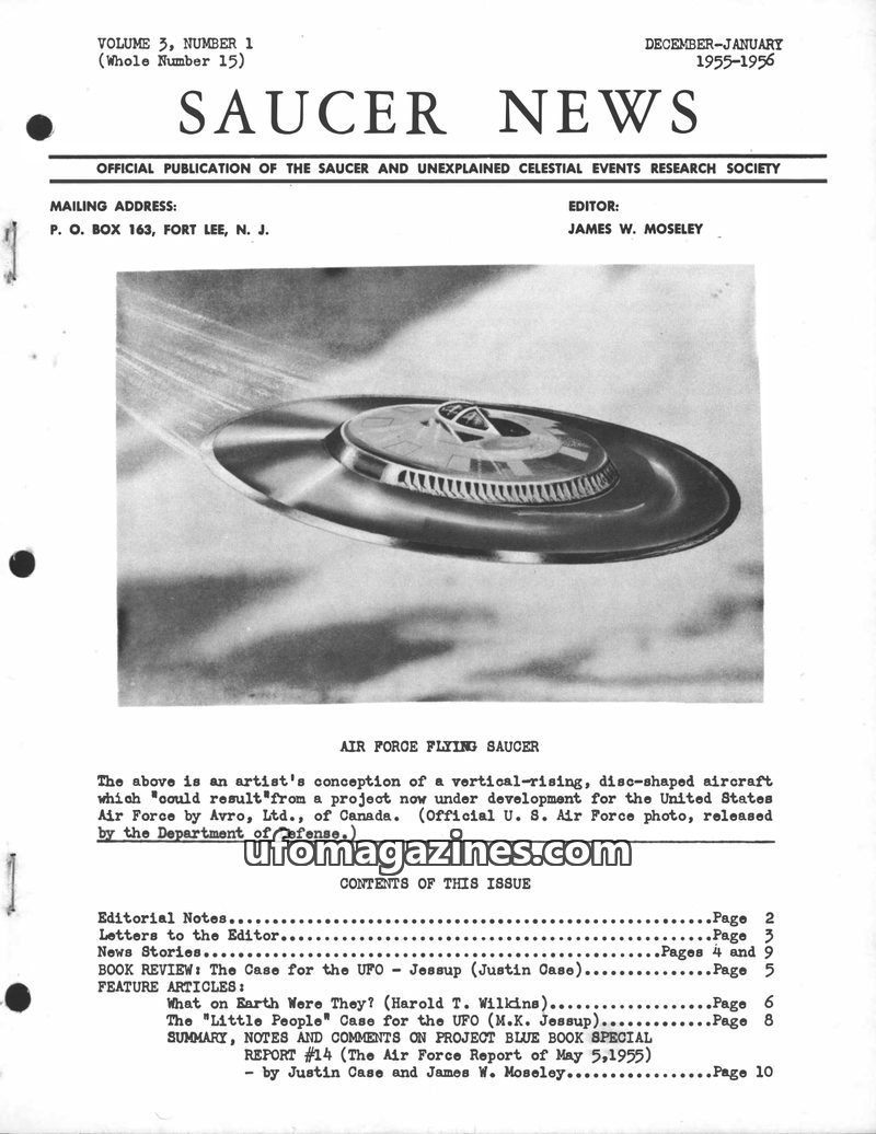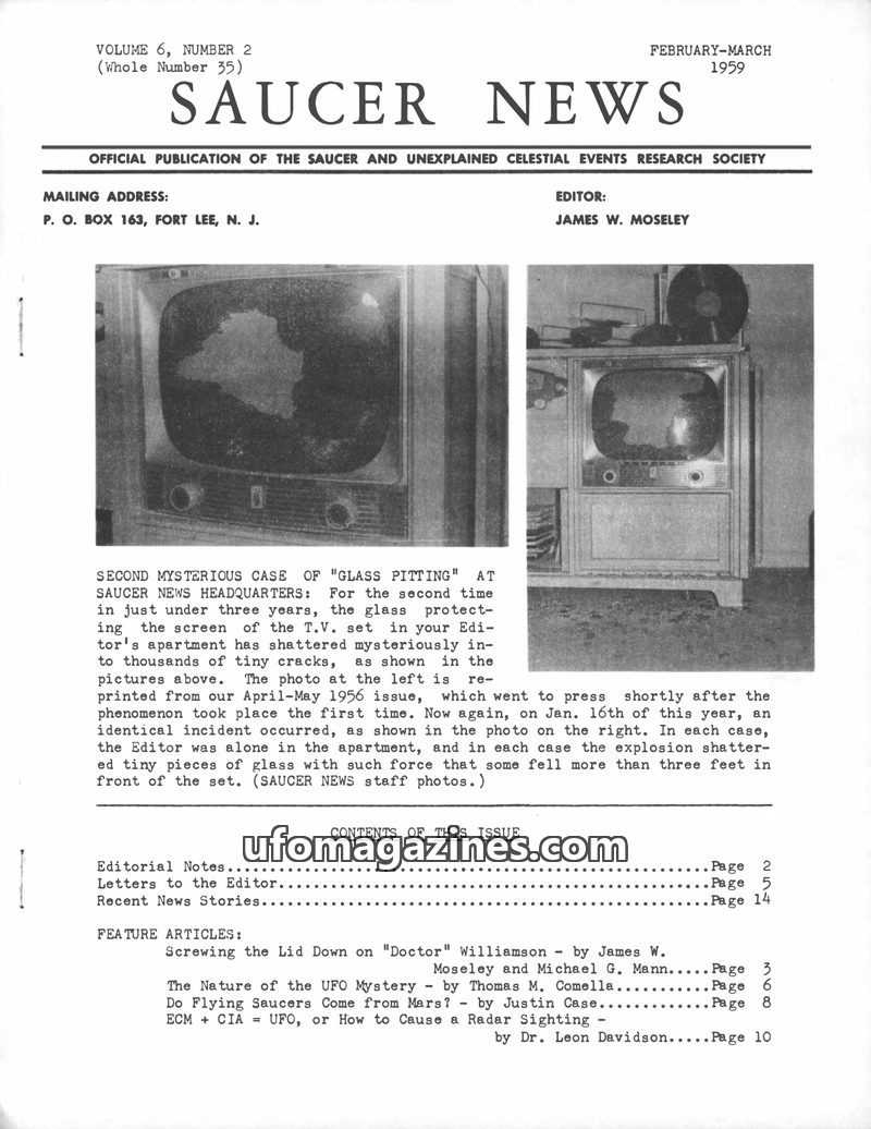 This issue of SAUCER NEWS addresses controversies surrounding the editor, James W. Moseley, refuting claims of him being an Air Force agent and exposing hoaxes by rival publication