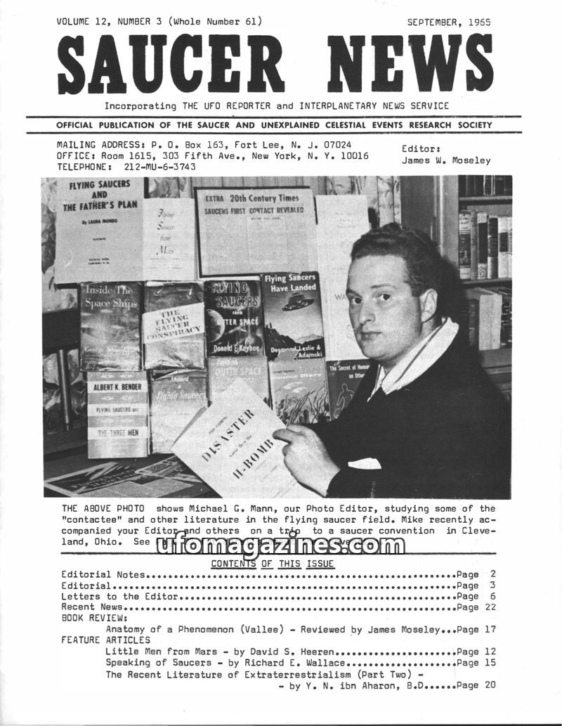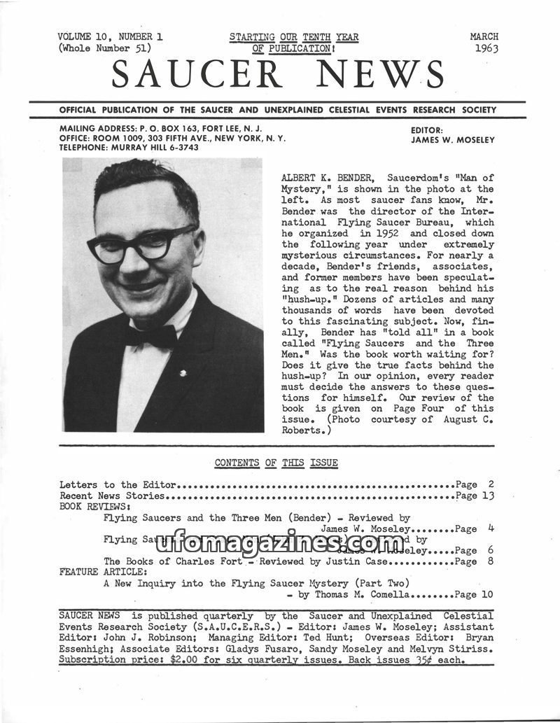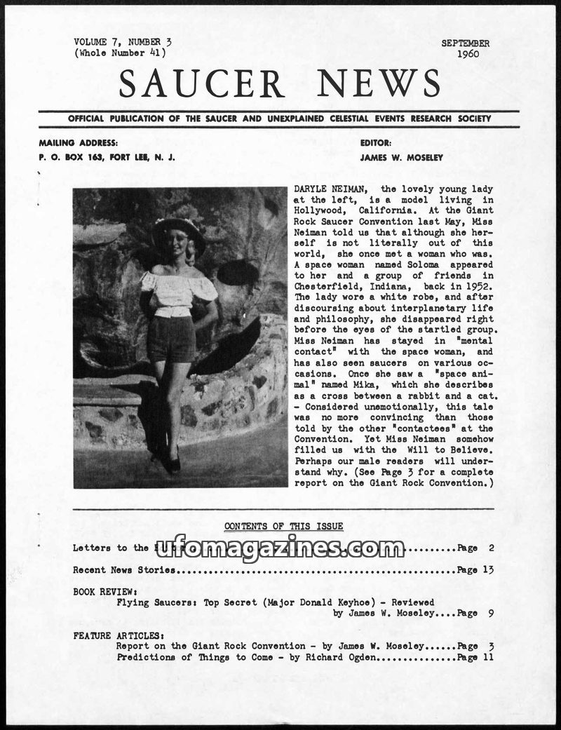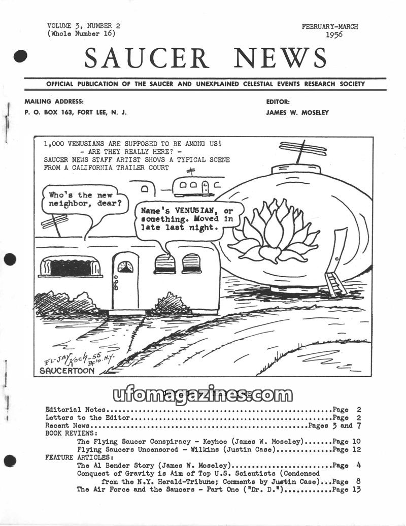 This issue of Saucer News explores the possibility of 1,000 Venusians living among us, details the mysterious 'hush-up' of Al Bender's flying saucer investigation, and discusses th