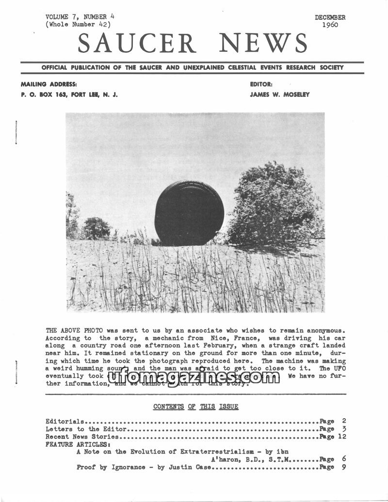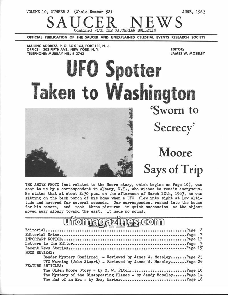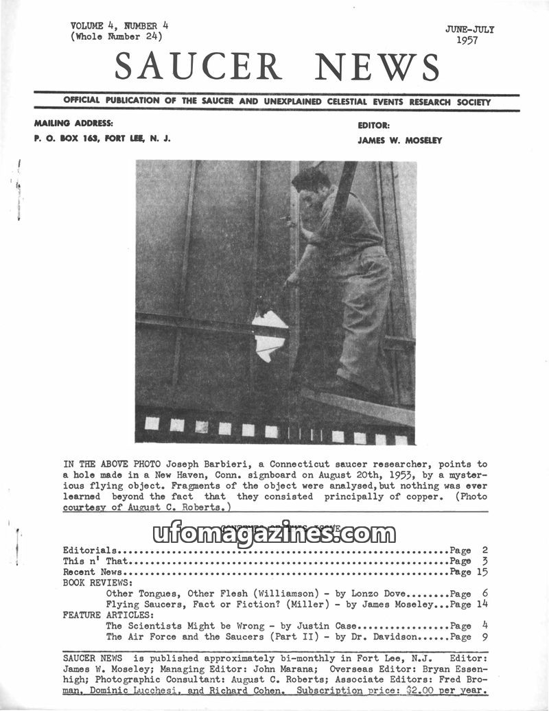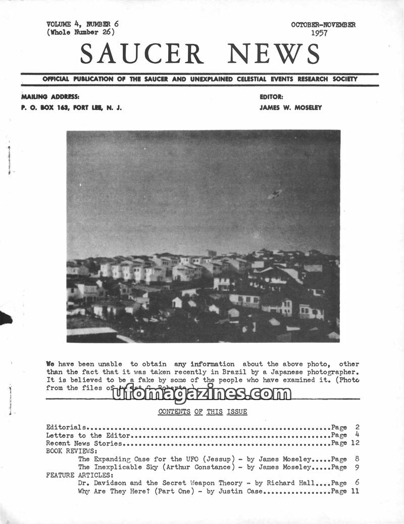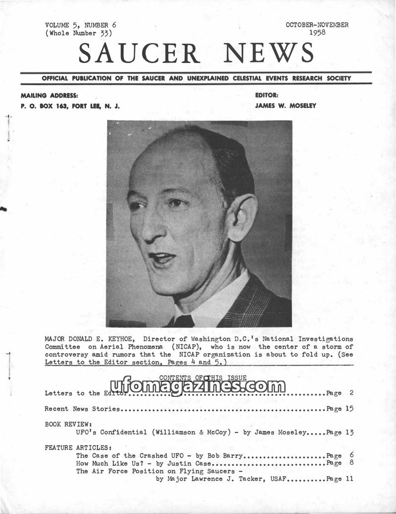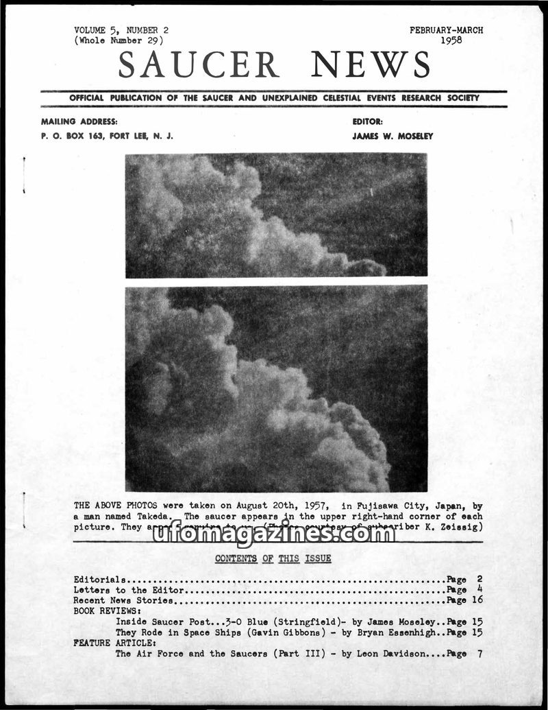 This issue of SAUCER NEWS delves into the controversy surrounding a hoax letter about editor James W. Moseley, refuting claims that he is an Air Force agent. It also critically exa