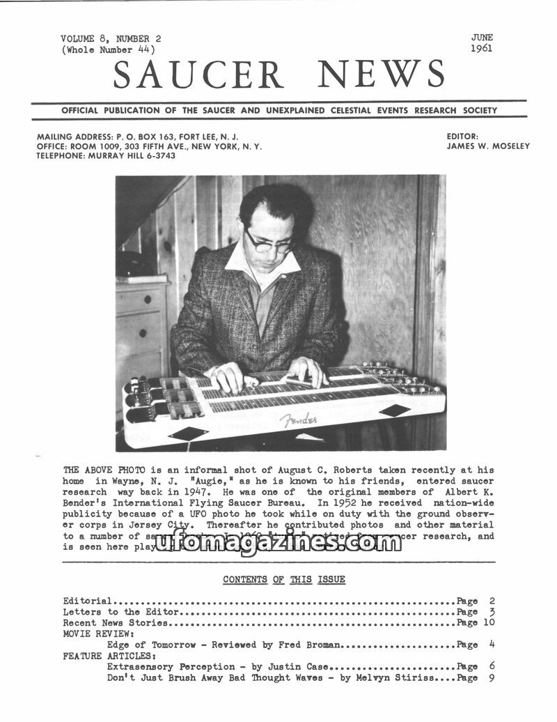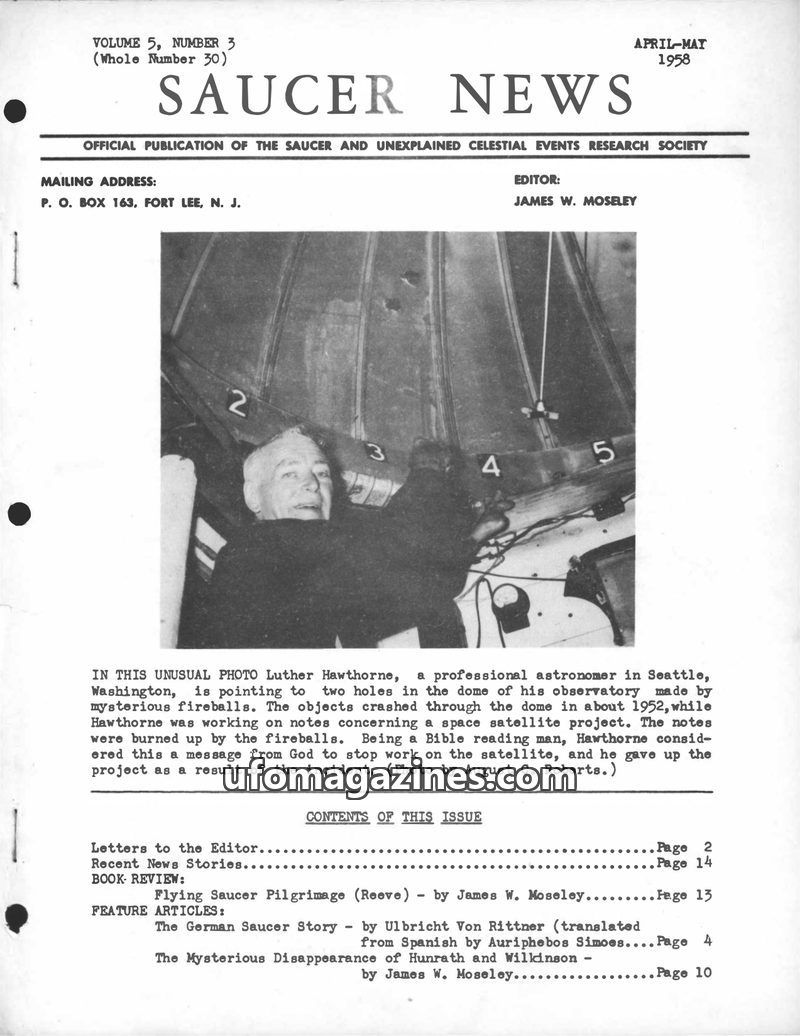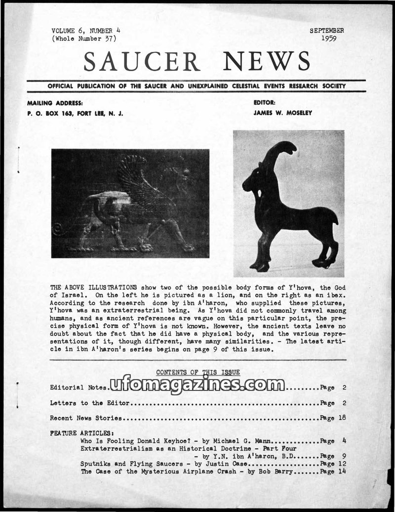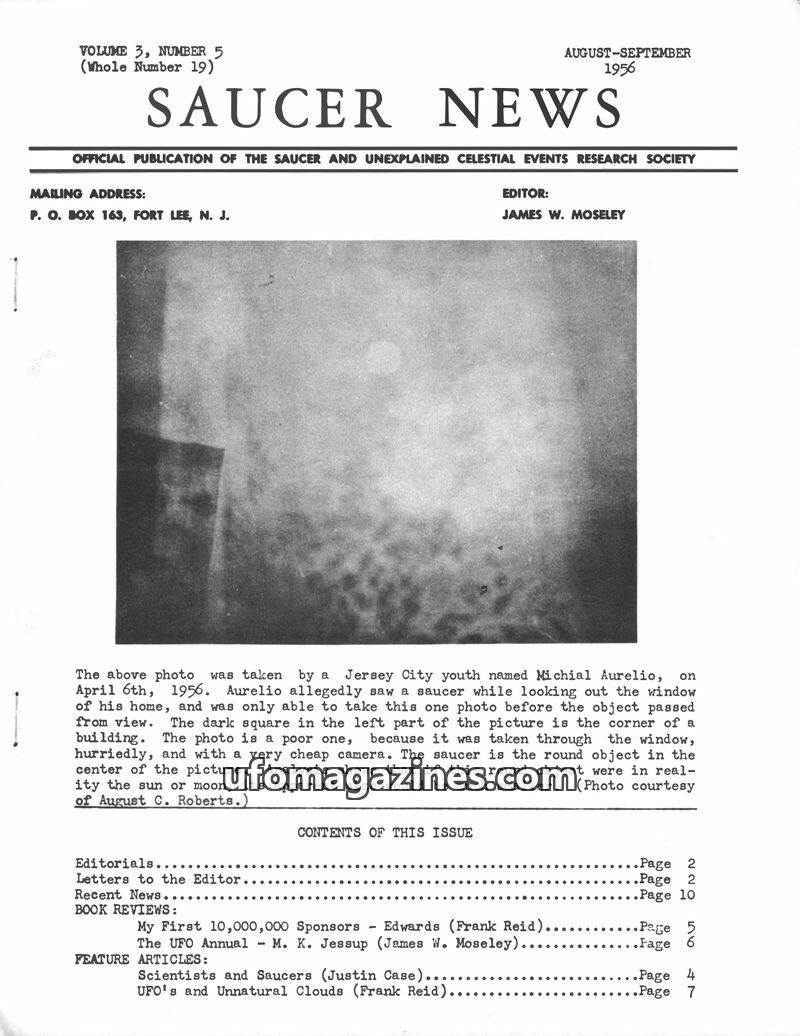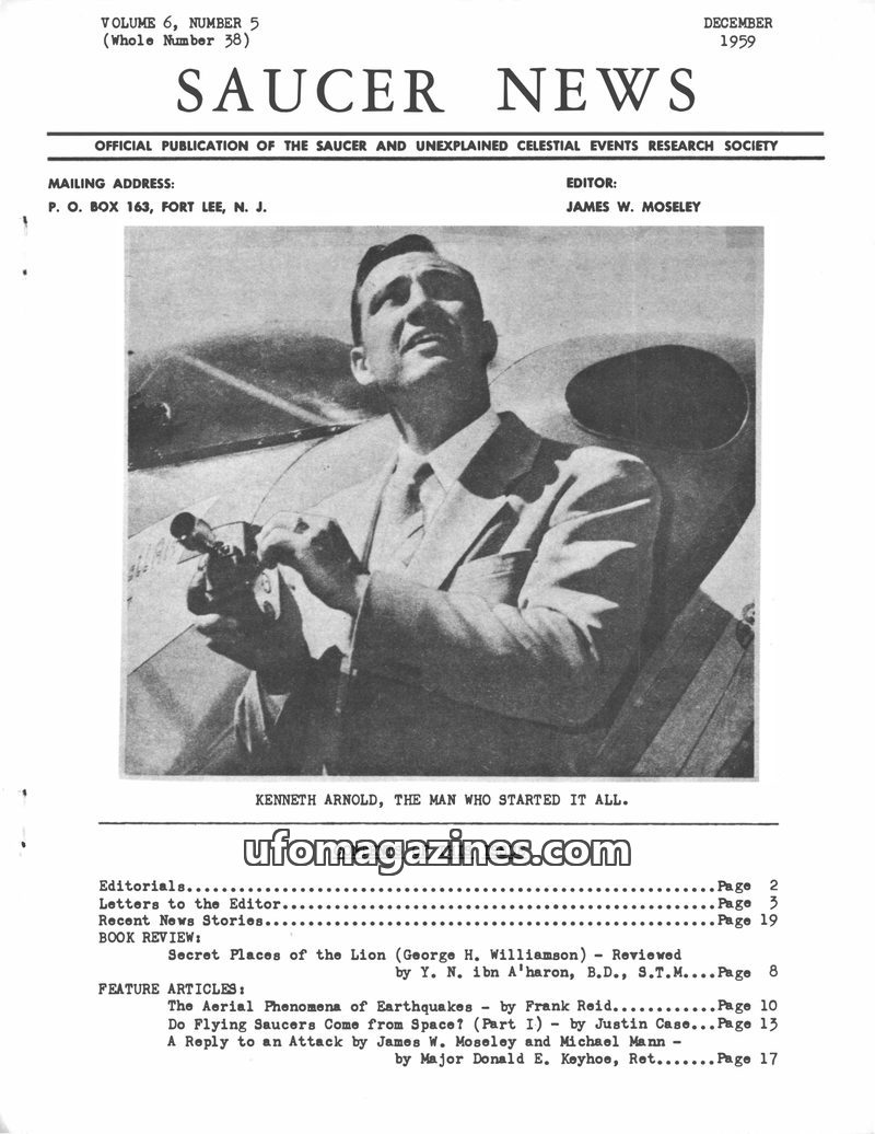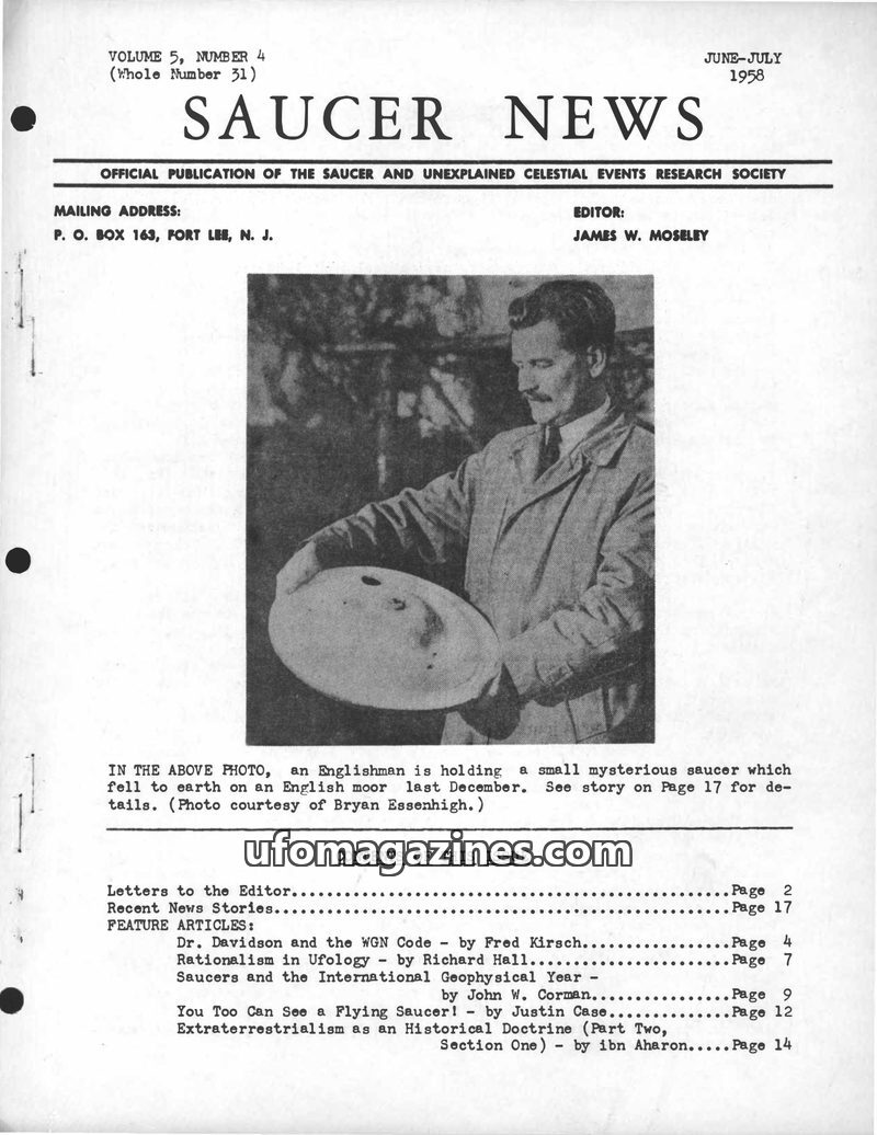 This issue of SAUCER NEWS delves into the controversy surrounding a hoax letter about editor James W. Moseley, refuting claims that he is an Air Force agent. It also critically exa