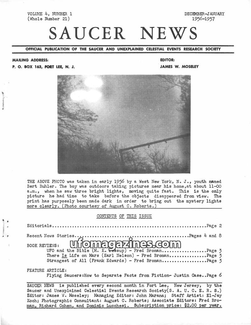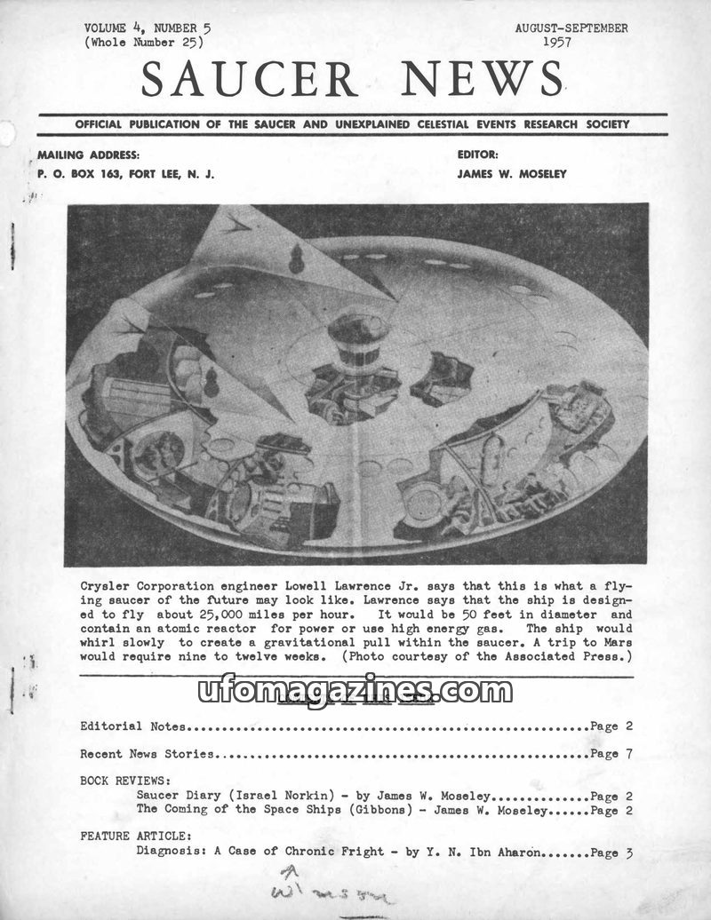 This issue of SAUCER NEWS announces the purchase of "Interplanetary News Service" and the merger of its subscribers. Editor James W. Moseley addresses criticism about his frequent
