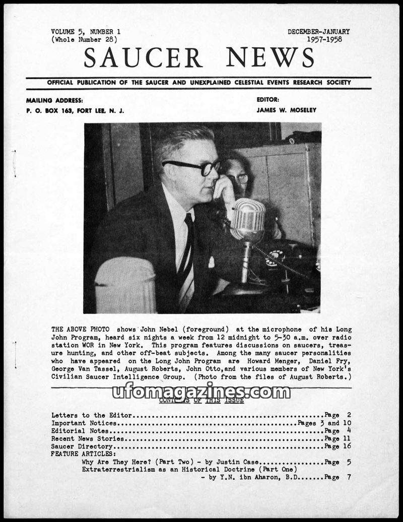 This issue of SAUCER NEWS from December-January 1957-1958 covers various UFO-related topics. It includes discussions on the John Nebel's 'Long John Program', letters to the editor
