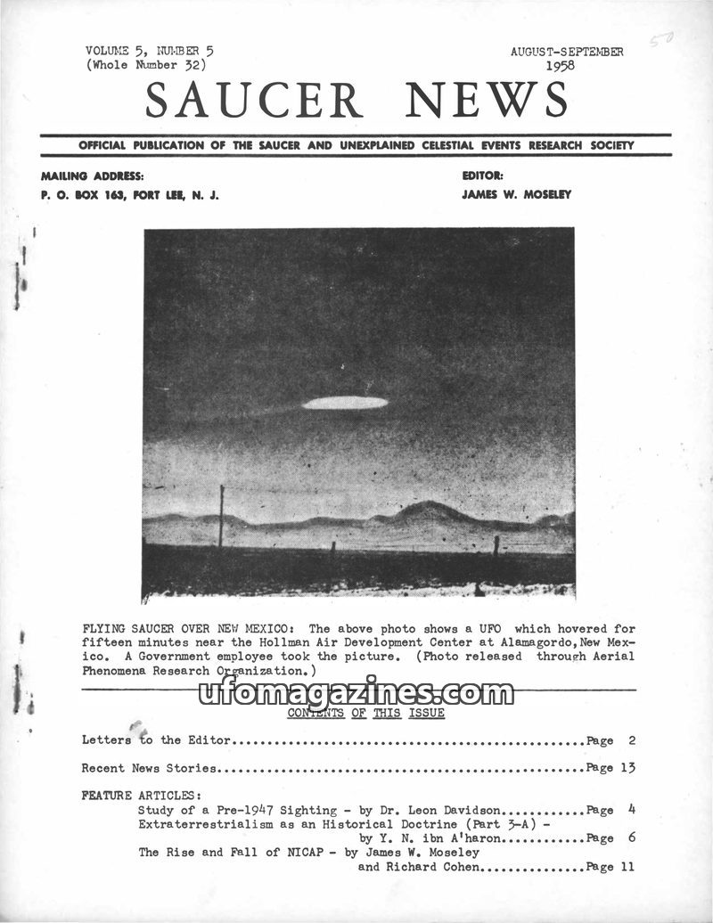 This issue of Saucer News from August-September 1958 covers a UFO sighting over New Mexico, photographed near the Hollman Air Development Center. It includes a study by Dr. Leon Da
