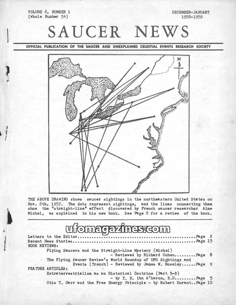 This issue of SAUCER NEWS covers the 'straight-line' effect in UFO sightings as described by Aime Michel, with a review of his book. It also delves into 'Extraterrestrialism as an