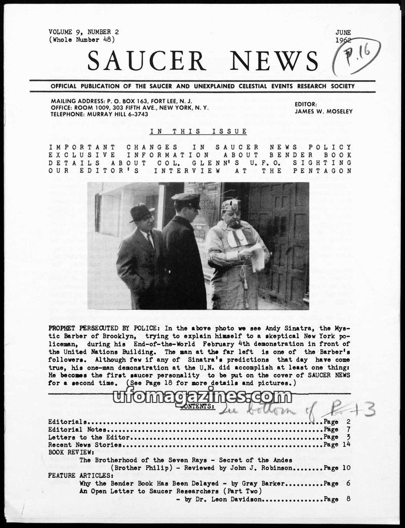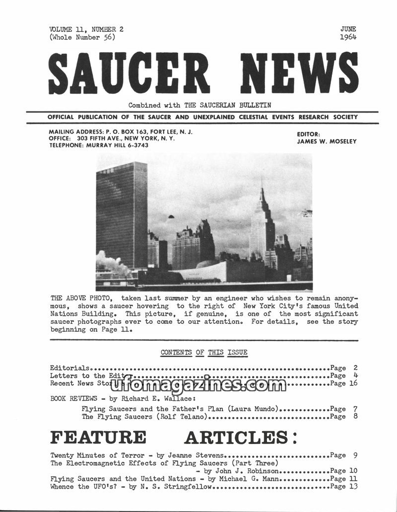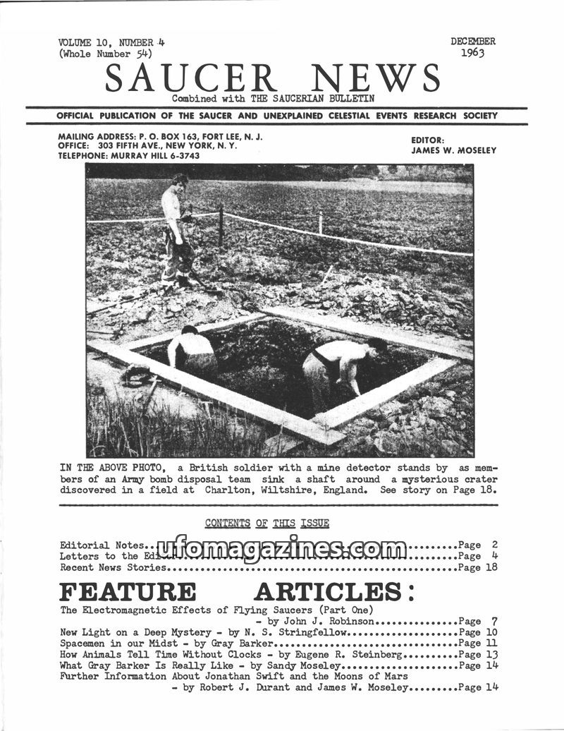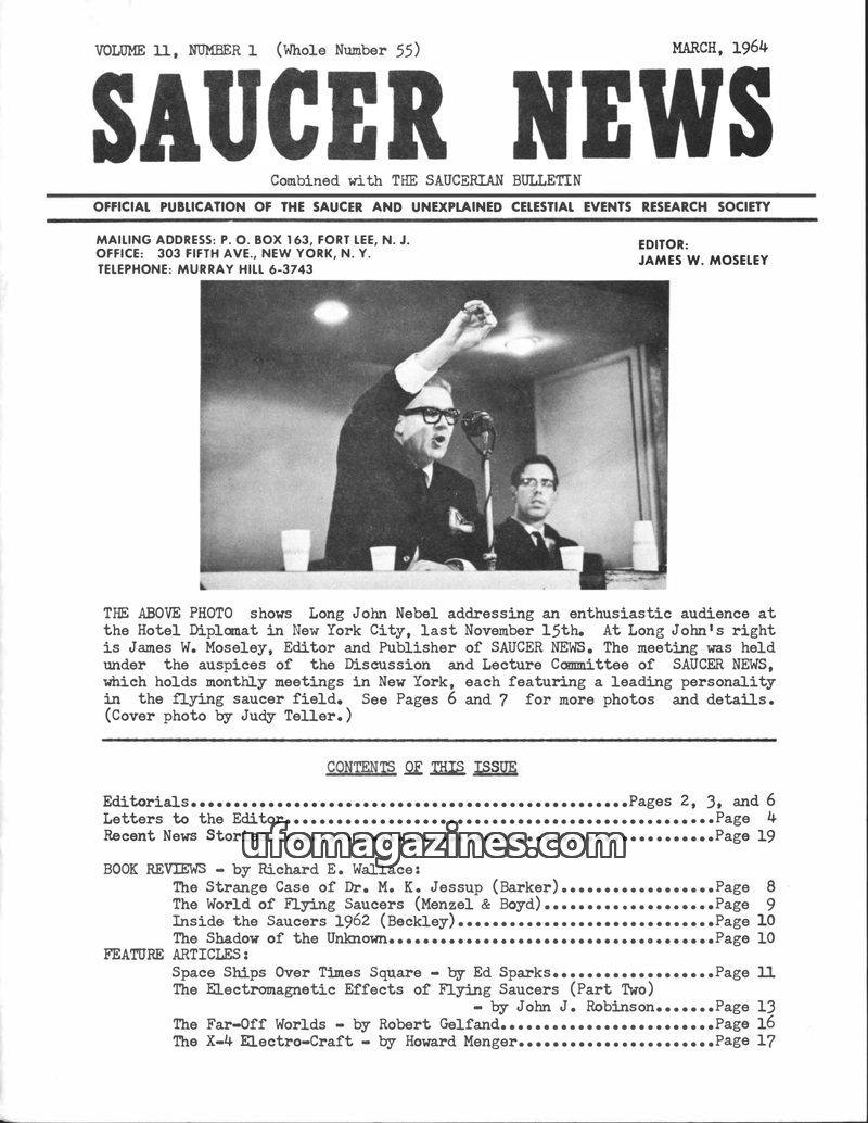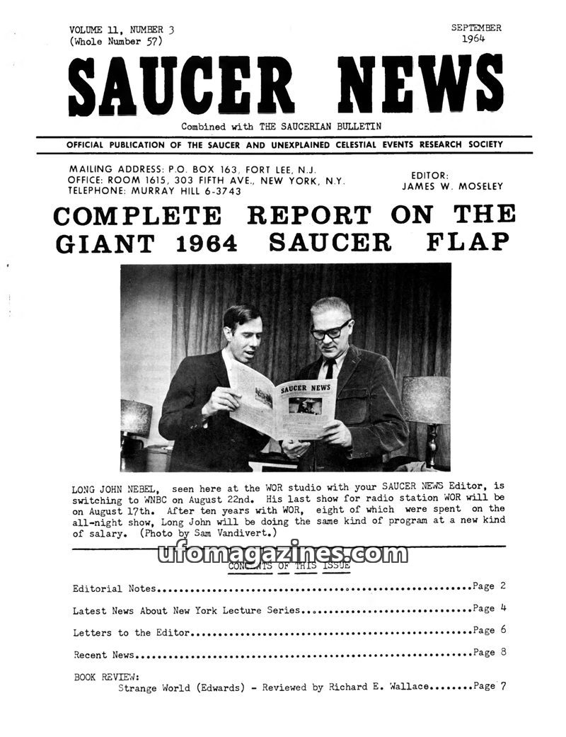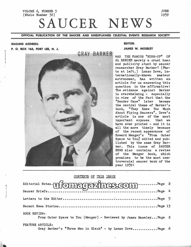 This issue of SAUCER NEWS delves into the personal feud between editors James W. Moseley and Gray Barker, revealing its origins in a personal incident. It also features a significa