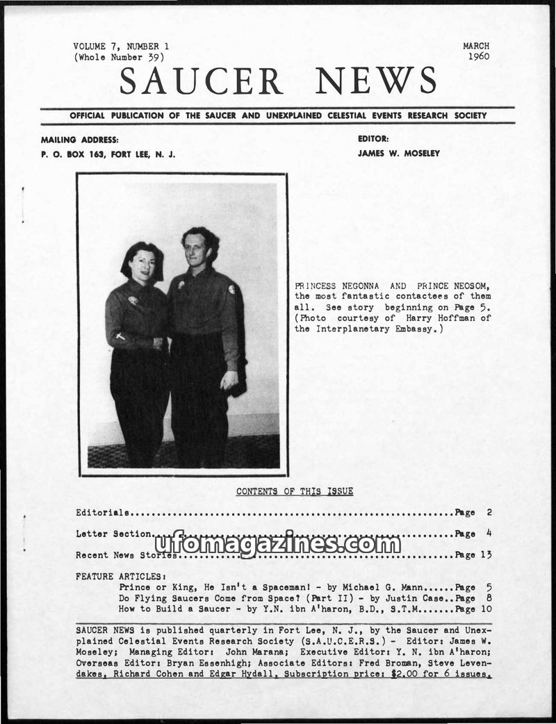 This issue of Saucer News, dated March 1960, highlights the controversial 'contactee' Prince Neosom (Lee Childers), exposing his claims as originating from comic books and detailin