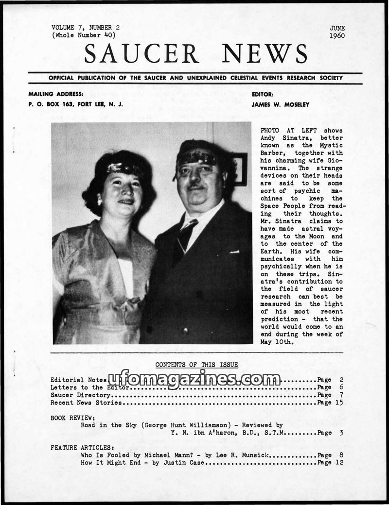 This issue of Saucer News features a photograph of Andy Sinatra and his wife, discussing his claims of psychic abilities and astral travel. A book review of George Hunt Williamson'