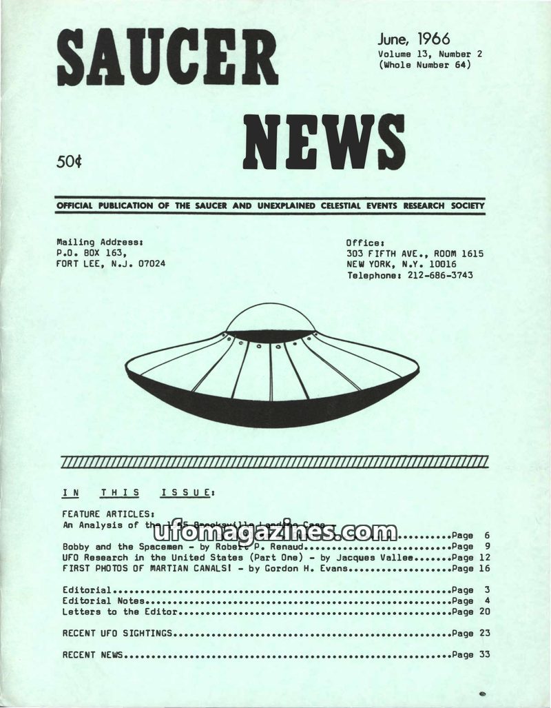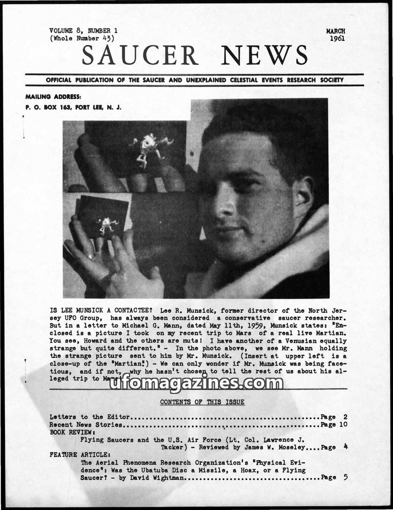 This issue of Saucer News explores the possibility of Lee Munsick being a contactee with claims of a trip to Mars. It features a review of Lt. Col. Lawrence J. Tacker's book and an