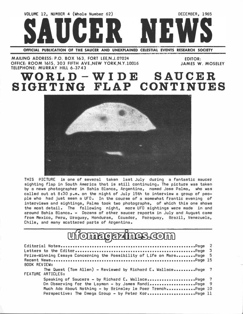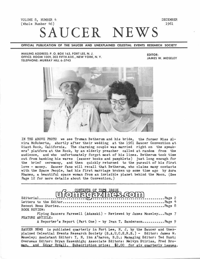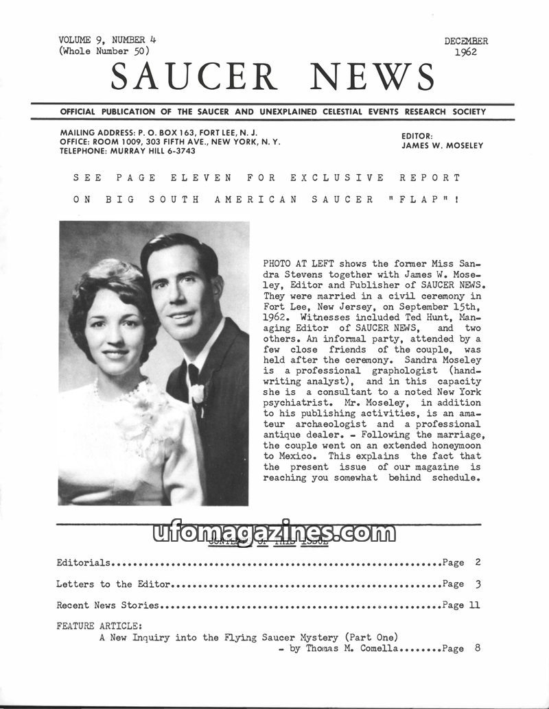 This issue of SAUCER NEWS, dated December 1962, announces the marriage of Editor James W. Moseley to Sandra Stevens and explains the delay in publication. It includes editorials ad