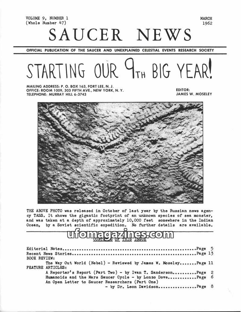 This issue of SAUCER NEWS from March 1962 delves into various UFO phenomena and related topics. Ivan T. Sanderson discusses the current state of ufology, noting public boredom and