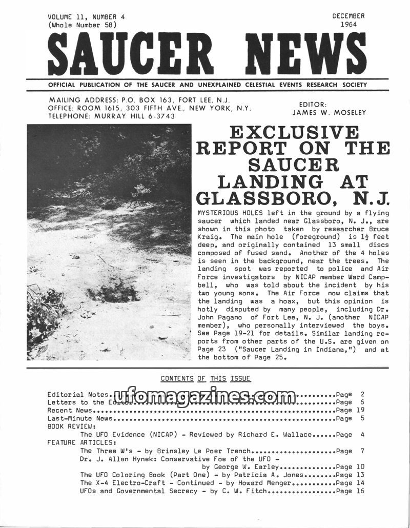 This December 1964 issue of SAUCER NEWS, published quarterly, covers a wide range of UFO-related topics. A major feature is an exclusive report on a reported saucer landing in Glas