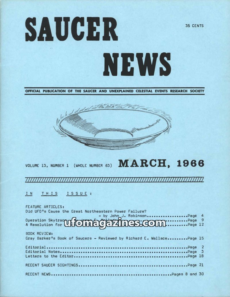 This issue of SAUCER NEWS investigates the November 9th, 1965, Great Northeastern Power Failure, exploring the theory that UFOs may have caused it by draining power from the grid.