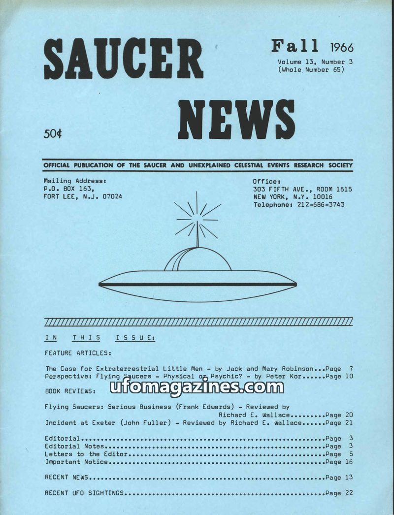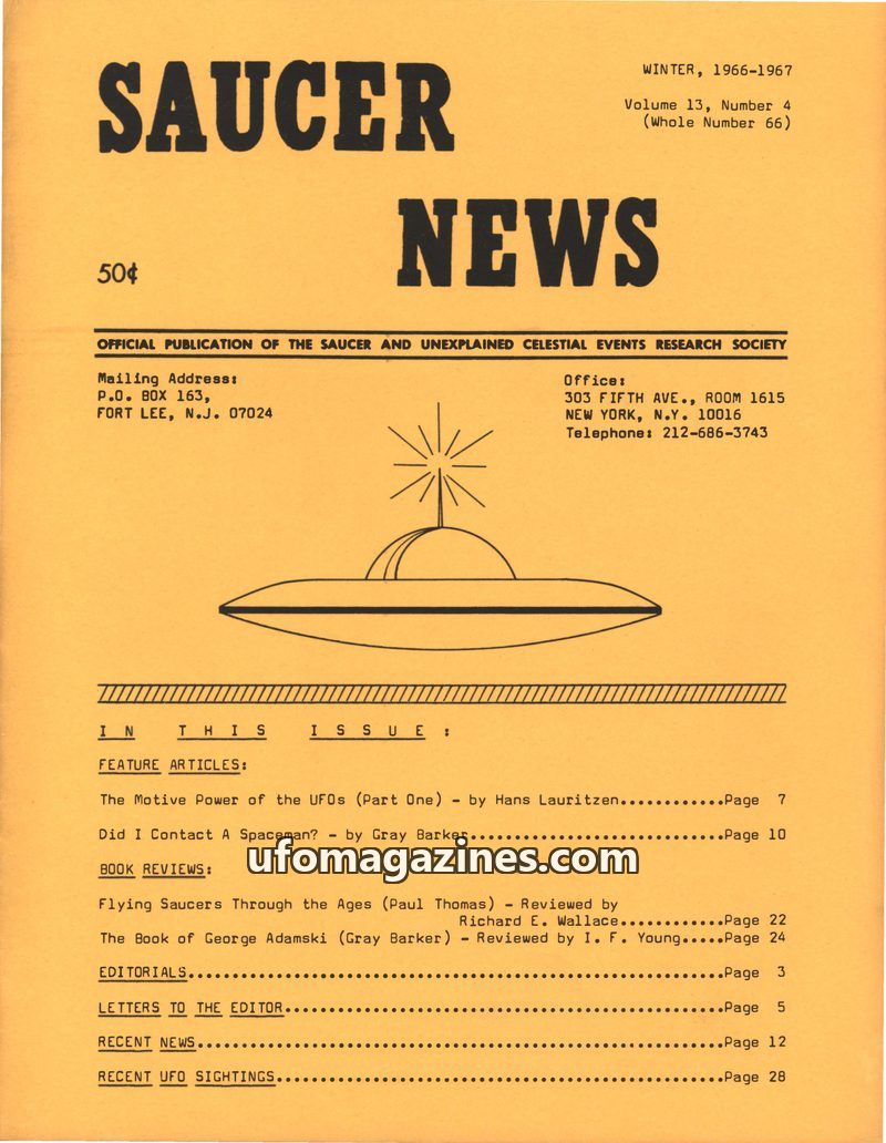 This issue of SAUCER NEWS, dated Winter 1966-1967, announces the opening of membership to the Saucer and Unexplained Celestial Events Research Society (S.A.U.C.E.R.S.) and details