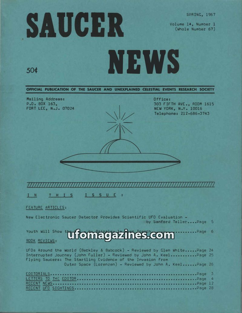 This issue of SAUCER NEWS, dated Spring 1967, highlights a new electronic "saucer detector" designed for scientific UFO evaluation. It extensively covers the upcoming 1967 Flying S