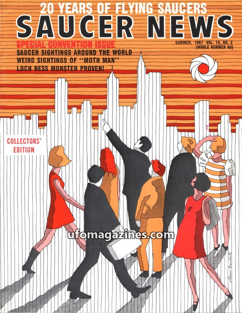 This issue of Saucer News, a special convention edition from Summer 1967, covers UFO sightings globally, the 'Moth Man' phenomenon, and claims of proof for the Loch Ness Monster. I