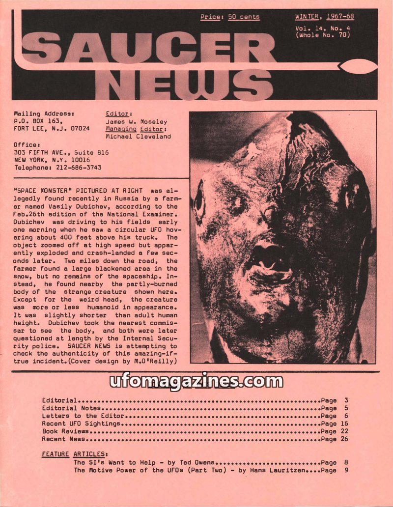 This issue of SAUCER NEWS from Winter 1967-68 reports on a purported 'space monster' discovery in Russia, detailing a UFO sighting and the subsequent finding of a strange, partly-b