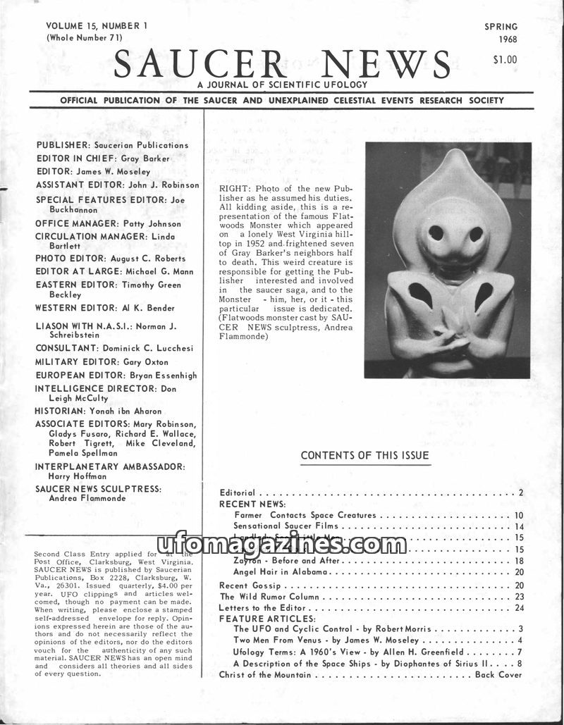 This issue of SAUCER NEWS, dated Spring 1968, features a new editorial stance with Gray Barker taking over as publisher from James W. Moseley, who will focus on research. The issue