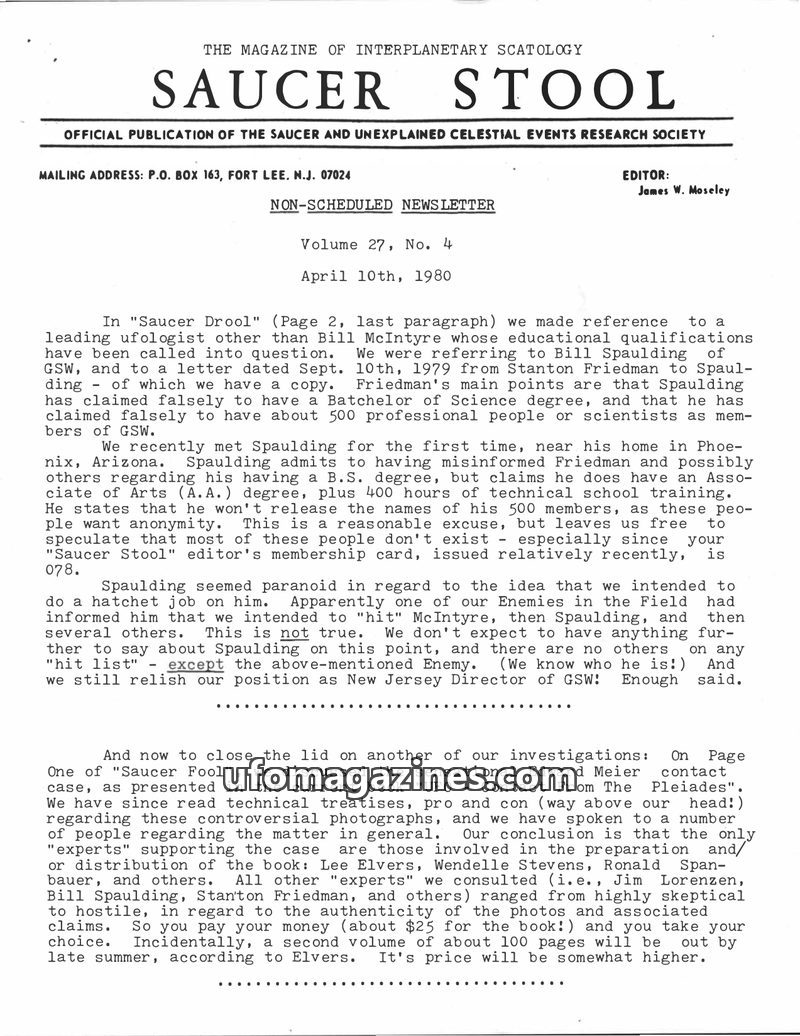 This issue of Saucer Stool delves into the ongoing debates within the ufology community, particularly concerning the educational claims of figures like Bill Spaulding and the authe