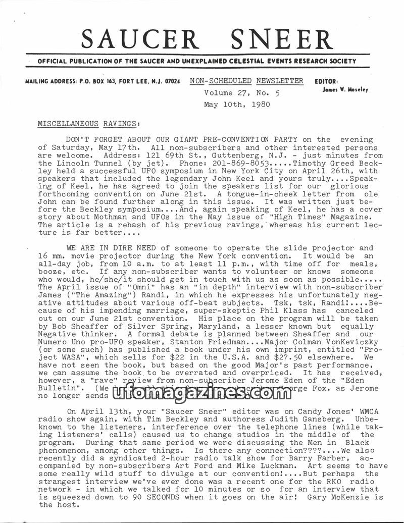 This issue of Saucer Sneer, dated May 10, 1980, covers a range of topics within the UFO and paranormal community. It includes announcements for a pre-convention party and the upcom