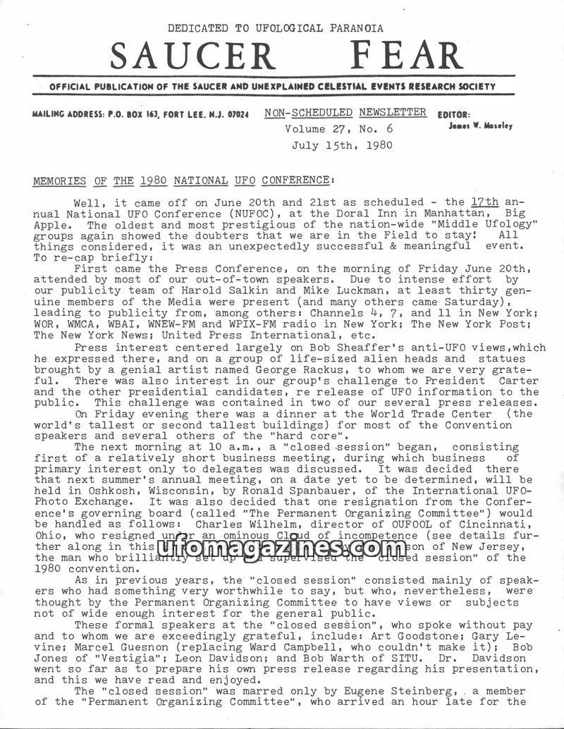 This issue of Saucer Fear details the 1980 National UFO Conference held in Manhattan, highlighting its success despite financial loss. It covers the press conference, the 'closed s