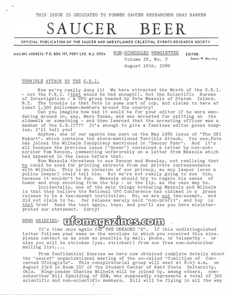 This issue of SAUCER BEER, dated August 10, 1980, details a conflict with the Scientific Bureau of Investigation (SBI) led by Pete Mazzola, accusing them of invading privacy. It al