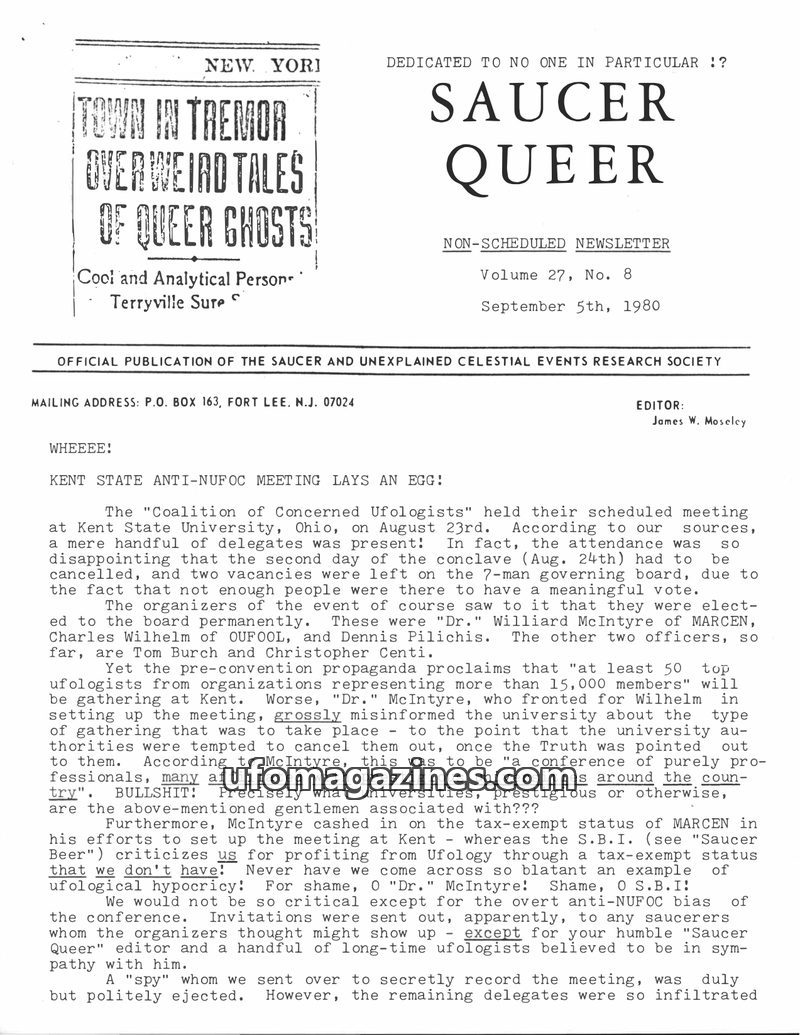 This issue of Saucer Queer critiques the 'Coalition of Concerned Ufologists' meeting at Kent State University, highlighting low attendance and alleged misinformation by organizers