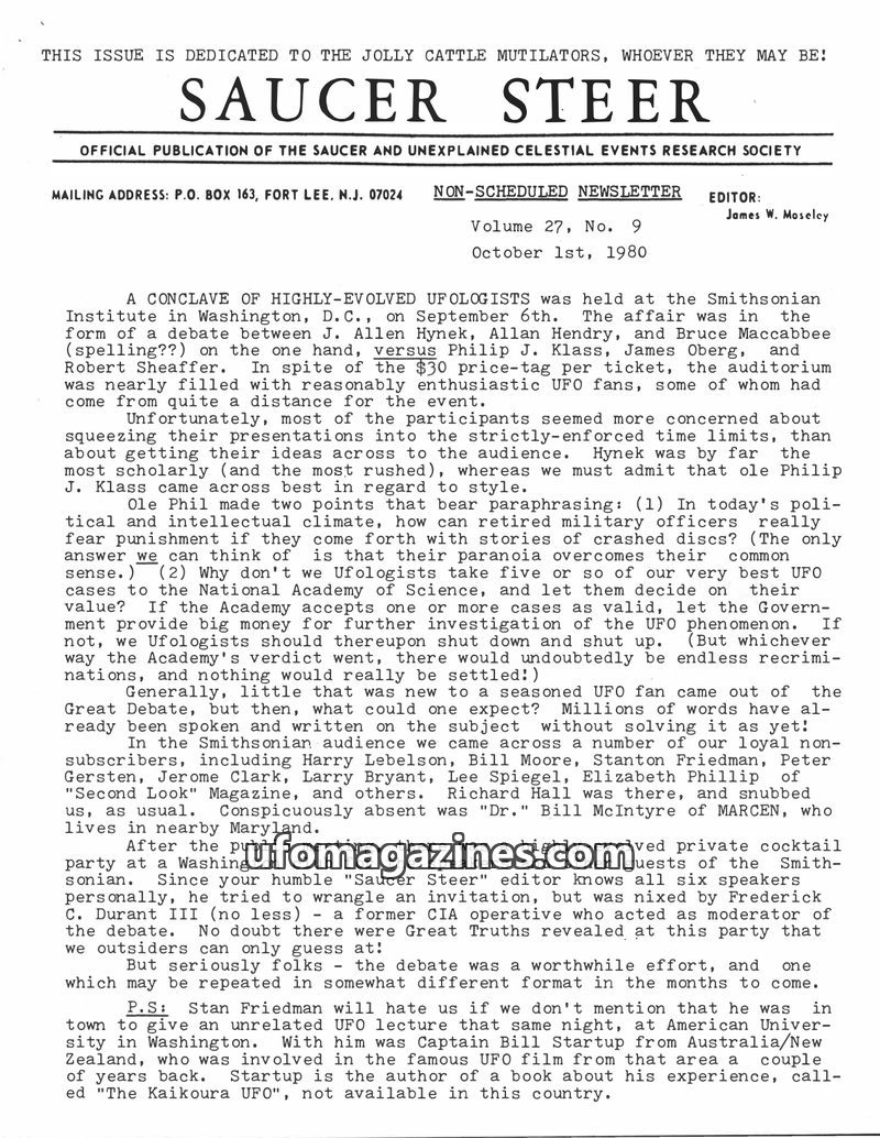 This issue of Saucer Steer reports on a UFO debate held at the Smithsonian featuring prominent ufologists. It also details a purported UFO crash in Mexico involving a creature and