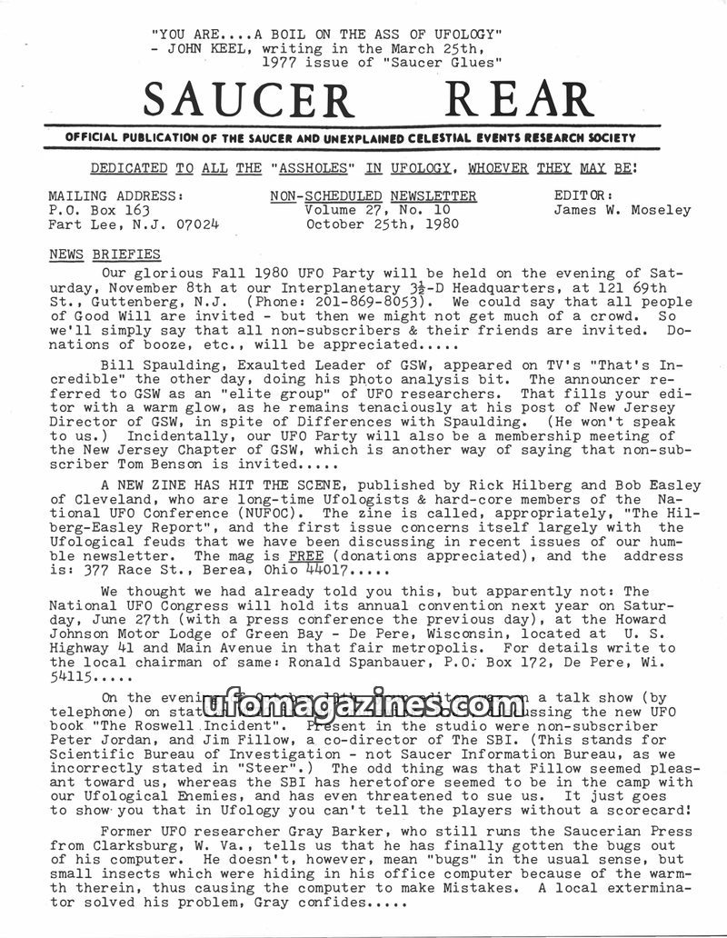 This issue of SAUCER REAR from October 25, 1980, covers various UFO-related events and discussions. It announces an upcoming UFO Party and GSW meeting in Guttenberg, N.J. The newsl