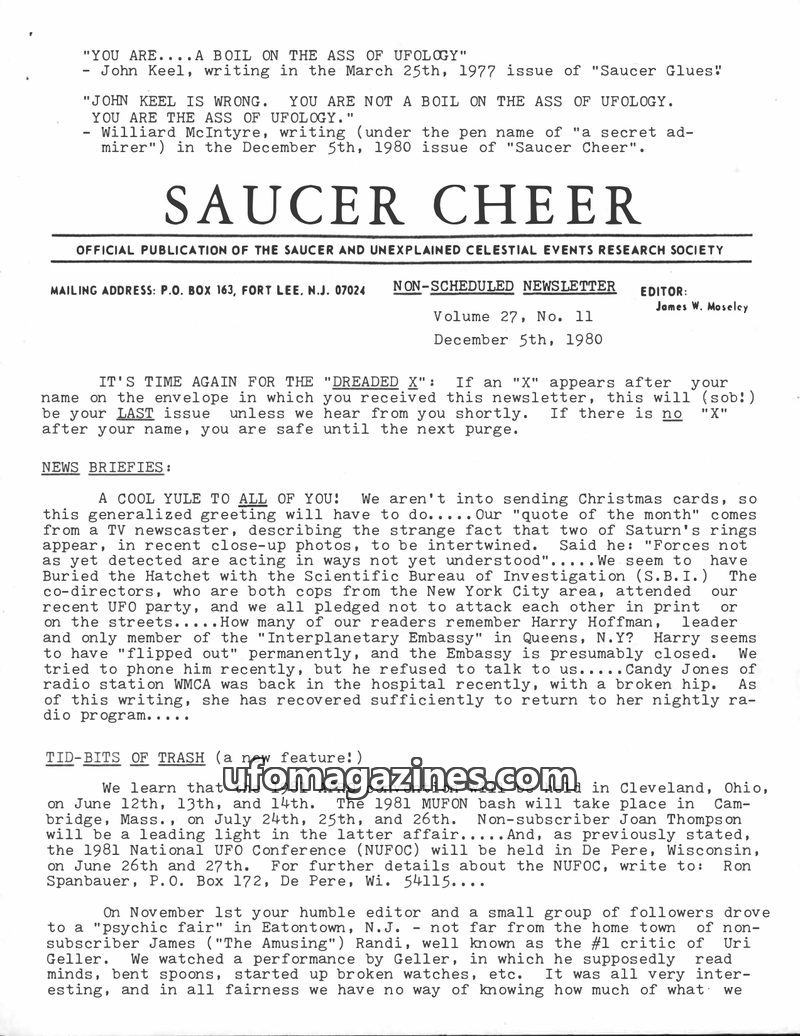 This issue of Saucer Cheer, dated December 5, 1980, includes a heated exchange between John Keel and Willard McIntyre regarding ufology. News briefs cover upcoming UFO conventions,