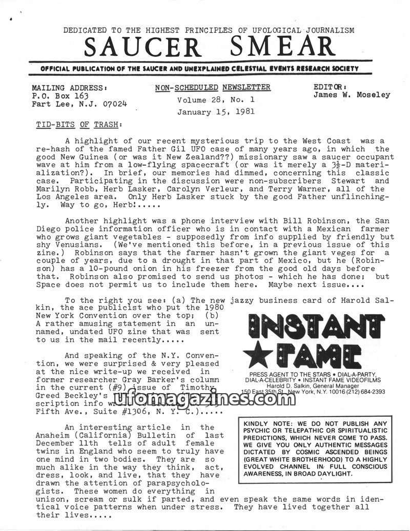 This issue of SAUCER SMEAR covers a range of topics including a re-hash of the Father Gil UFO case, a report on a Mexican farmer growing giant vegetables with extraterrestrial help