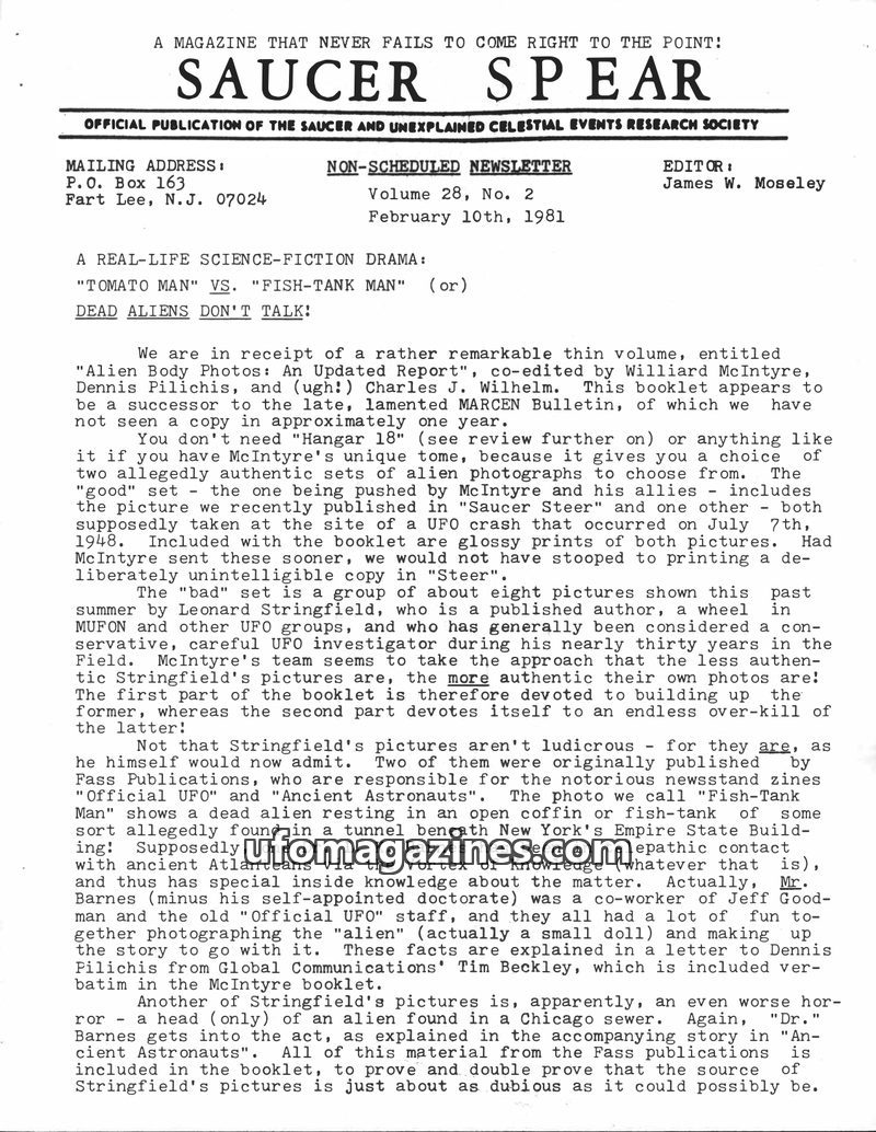 This issue of Saucer Spear critically examines the booklet 'Alien Body Photos,' co-edited by Williard McIntyre, which presents two sets of alleged alien photographs. The magazine q