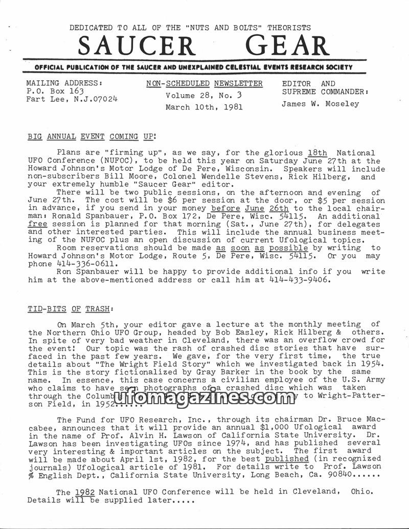This issue of Saucer Gear announces the upcoming 18th National UFO Conference in De Pere, Wisconsin, detailing session costs and reservation information. It also covers 'Tid-Bits o