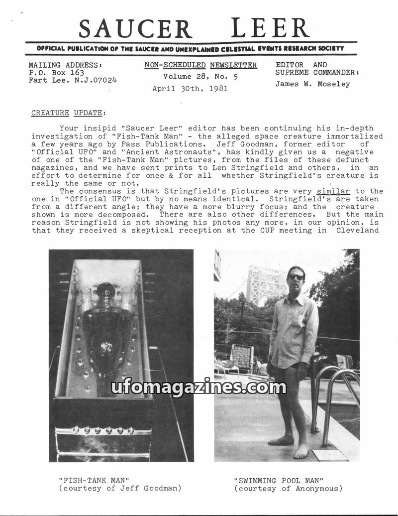 This issue of Saucer Leer delves into "Creature Update" concerning the "Fish-Tank Man" and "Jersey Devil" alleged entities, presenting photographs and discussing their authenticity