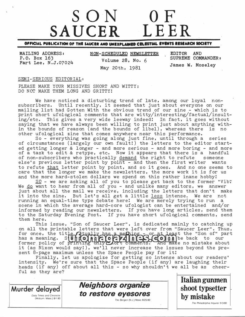 This issue of "Son of Saucer Leer" addresses a trend of overly long and serious letters to the editor, urging brevity and wit. It includes an analysis of a "Fish-Tank Man" photo, r