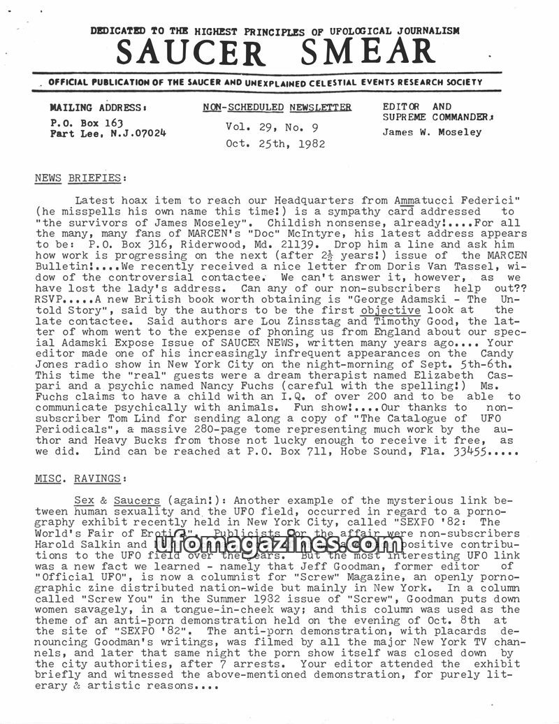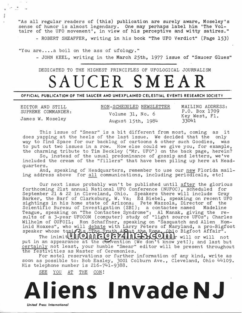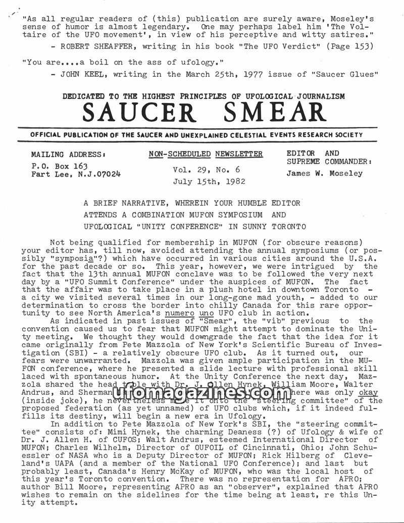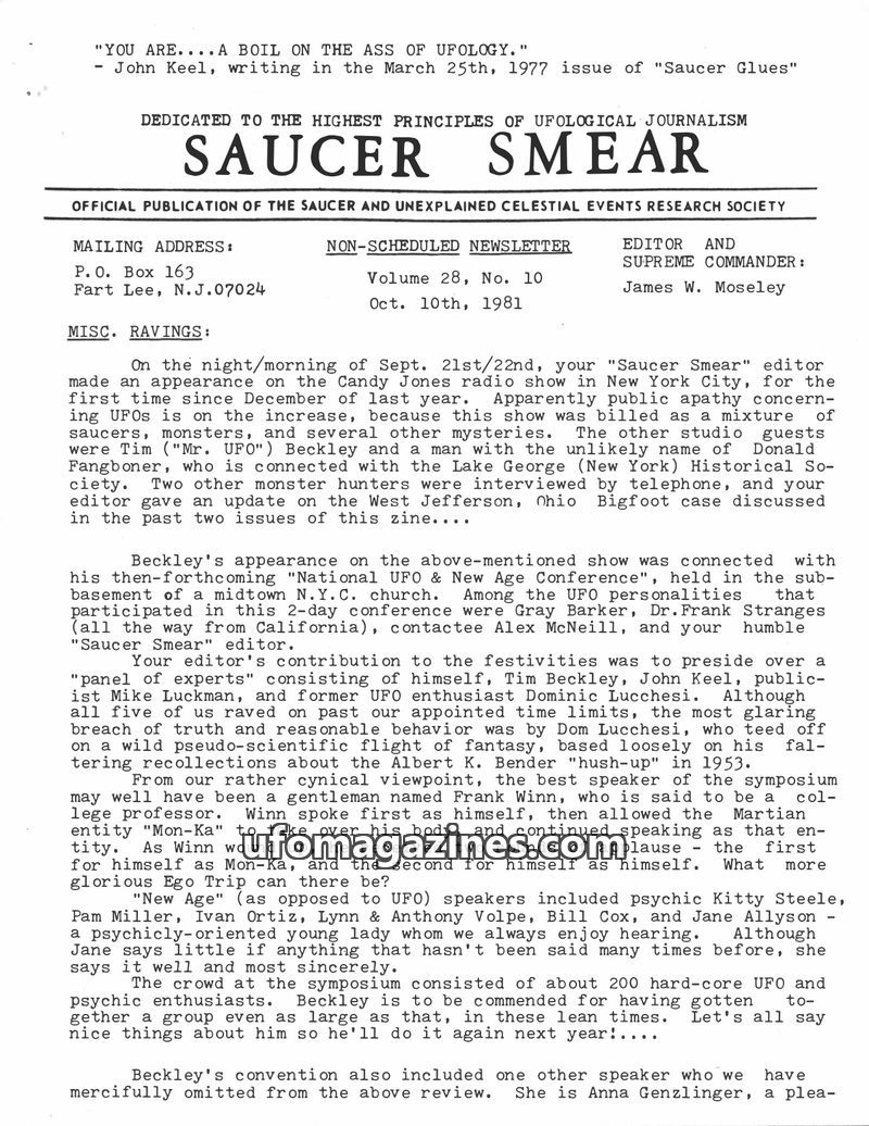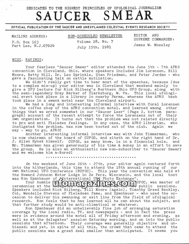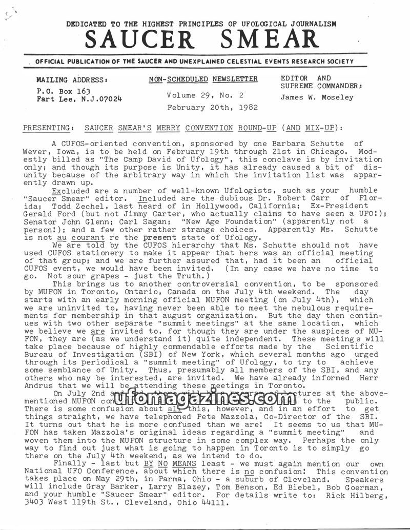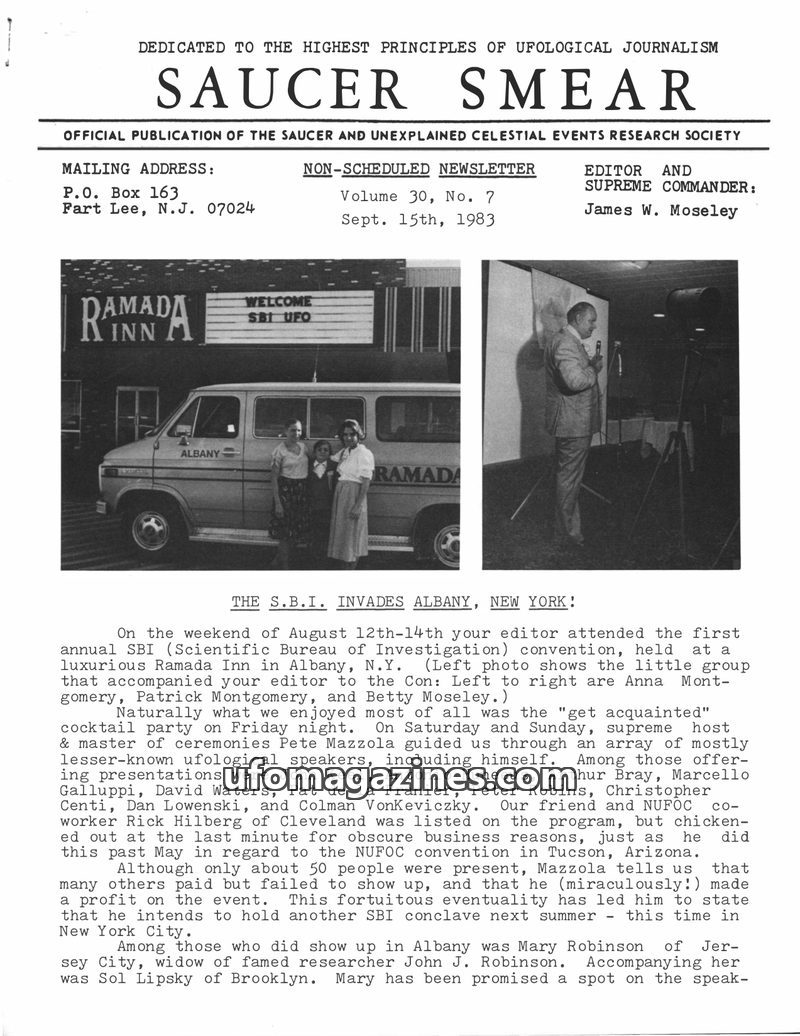 This issue of Saucer Smear reports on the first annual SBI convention in Albany, NY, attended by editor James W. Moseley and featuring various ufological speakers. It extensively c