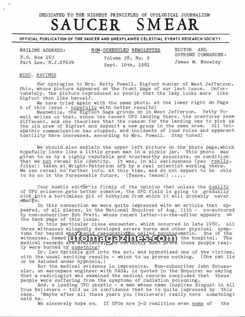 This issue of Saucer Smear covers a variety of topics including Bigfoot sightings in Ohio, a purported extraterrestrial encounter with radiation poisoning, and debates surrounding