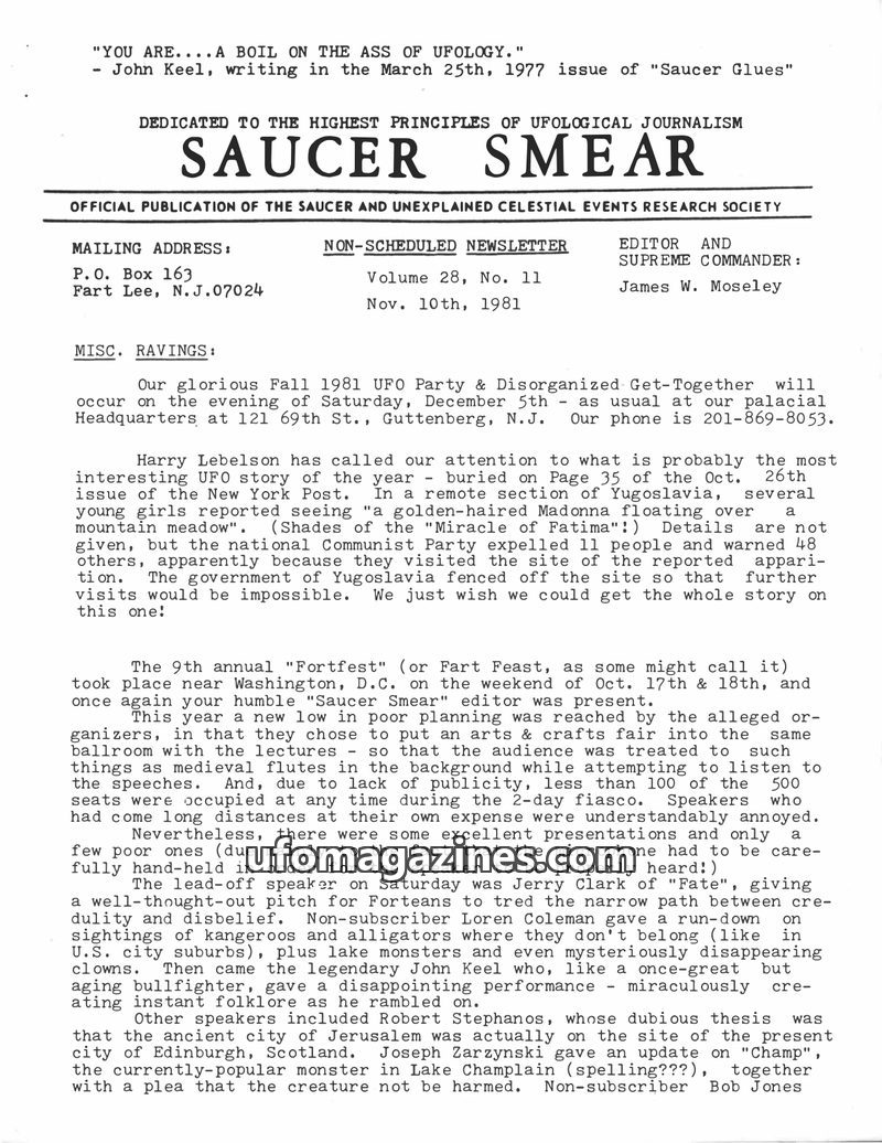 This issue of Saucer Smear, dated November 10, 1981, features a variety of UFO-related news and personal accounts. It announces an upcoming UFO party in Guttenberg, N.J., and repor