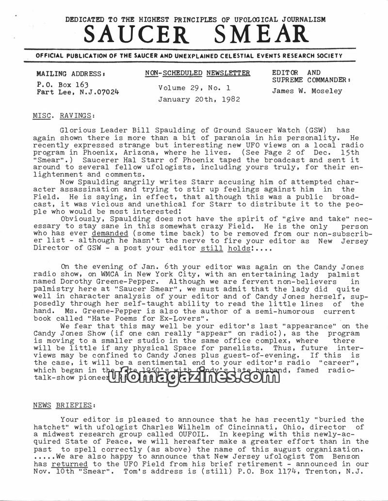 This issue of SAUCER SMEAR, dated January 20th, 1982, covers various ufological topics and community news. It includes 'Misc. Ravings' discussing a dispute between Bill Spaulding a