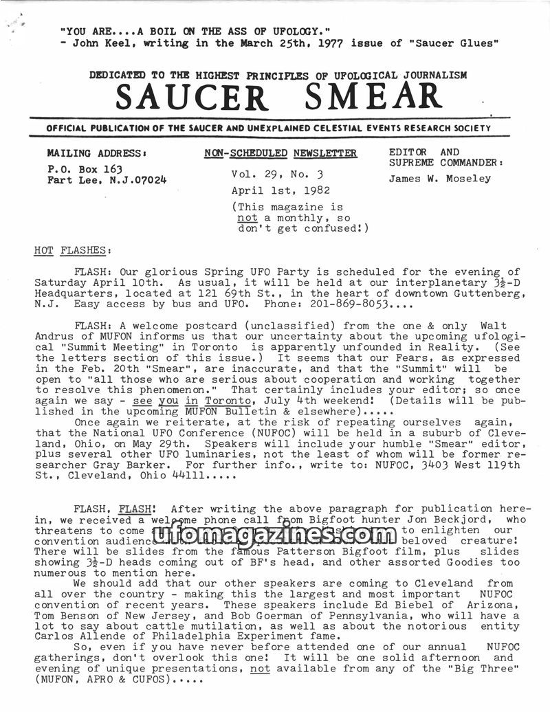 This issue of Saucer Smear from April 1982 covers upcoming UFO conferences like the MUFON Summit in Toronto and the NUFOC in Cleveland, which will feature speakers on Bigfoot and c