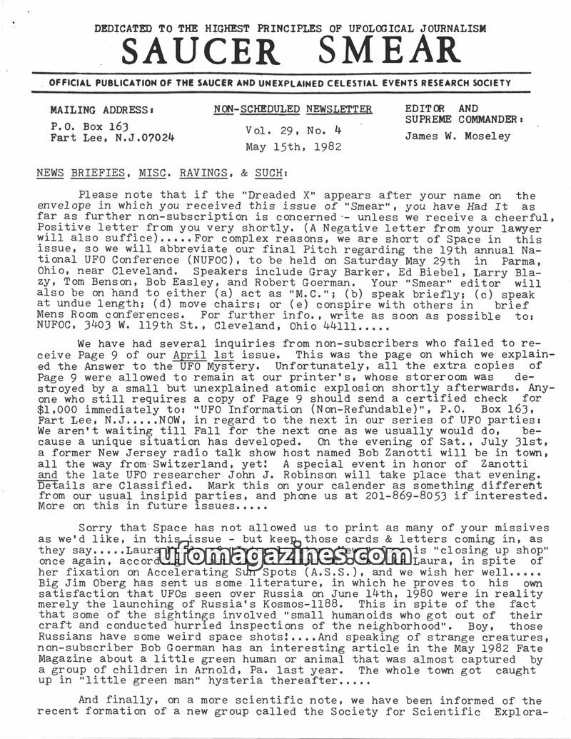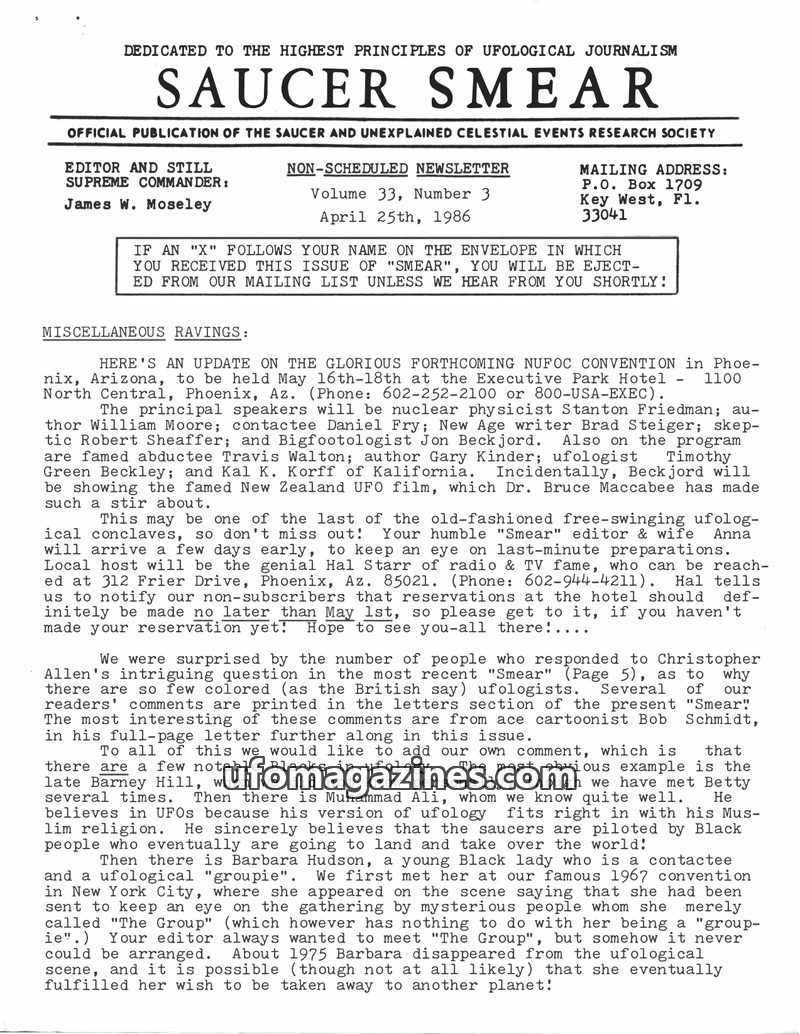 This issue of Saucer Smear features a variety of ufological and paranormal topics. It includes a preview of the National UFO Conference, discussions on alleged UFO sightings and en