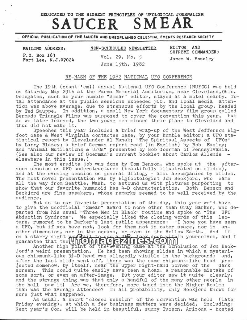 This issue of SAUCER SMEAR covers the 1982 National UFO Conference in Cleveland, Ohio, detailing various presentations on topics like Bigfoot, UFOs, and the Abduction Syndrome. It