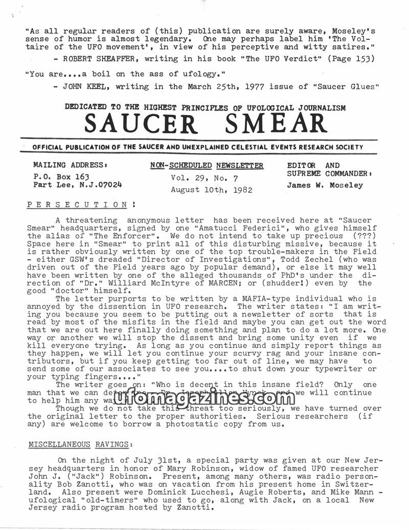 This issue of Saucer Smear, dated August 10, 1982, features a threatening anonymous letter received by the publication, allegedly from 'The Enforcer,' warning against dissent in UF